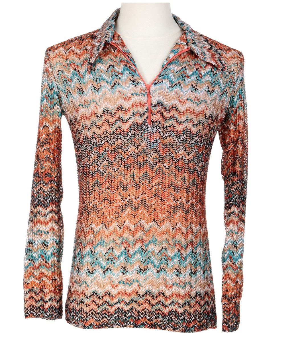 84. Samuel Barnett "Dirk Gently" retro shirt from Dirk Gently's Holistic Detective Agency. (BBC America, 2016-2017) Consisting of a long-sleeve shirt constructed of woven psychedelic ombre over nude synthetic fabric with flared collar and zip-up neck. Retaining internal costumer's label marked "1. Dirk". Selected by Dirk from the Bergsberg County Sheriff station lost-and-found. In very good condition. Starting Bid: $25