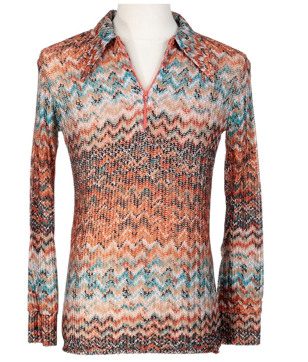 85. Samuel Barnett "Dirk Gently" retro shirt from Dirk Gently's Holistic Detective Agency. (BBC America, 2016-2017) Consisting of a long-sleeve shirt composed of woven psychedelic ombre over nude synthetic fabric with flared collar and zip-up neck. Marked internally "1. Dirk". A groovy 70s throwback, one wonders how long the garment was sitting in the Bergsberg County Sheriff station lost-and-found before Dirk pressed it into service. Light production wear. In very good condition Starting Bid: $25