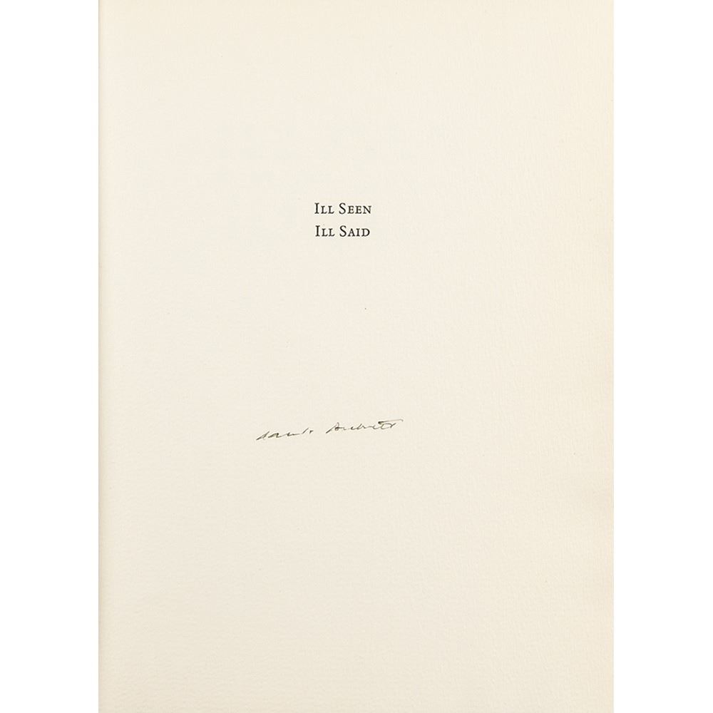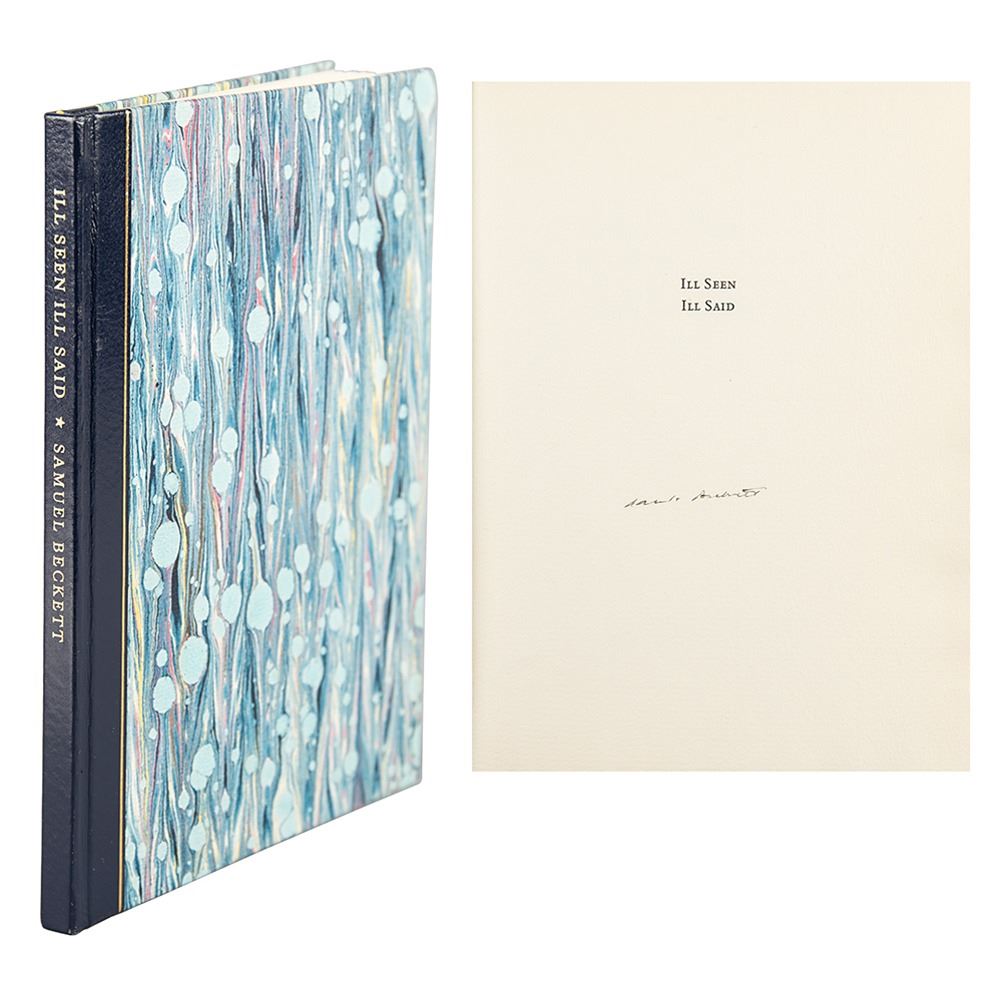 Signed book: Ill Seen Ill Said. Limited edition, numbered 150/299. Northridge, CA: Lord John Press, 1982. Hardcover quarter bound in gilt-stamped navy leather with blue marbled boards, 6.25 x 8, 45 pages. Diminutively signed on the half-title page in black ink by Samuel Beckett. In very fine condition.