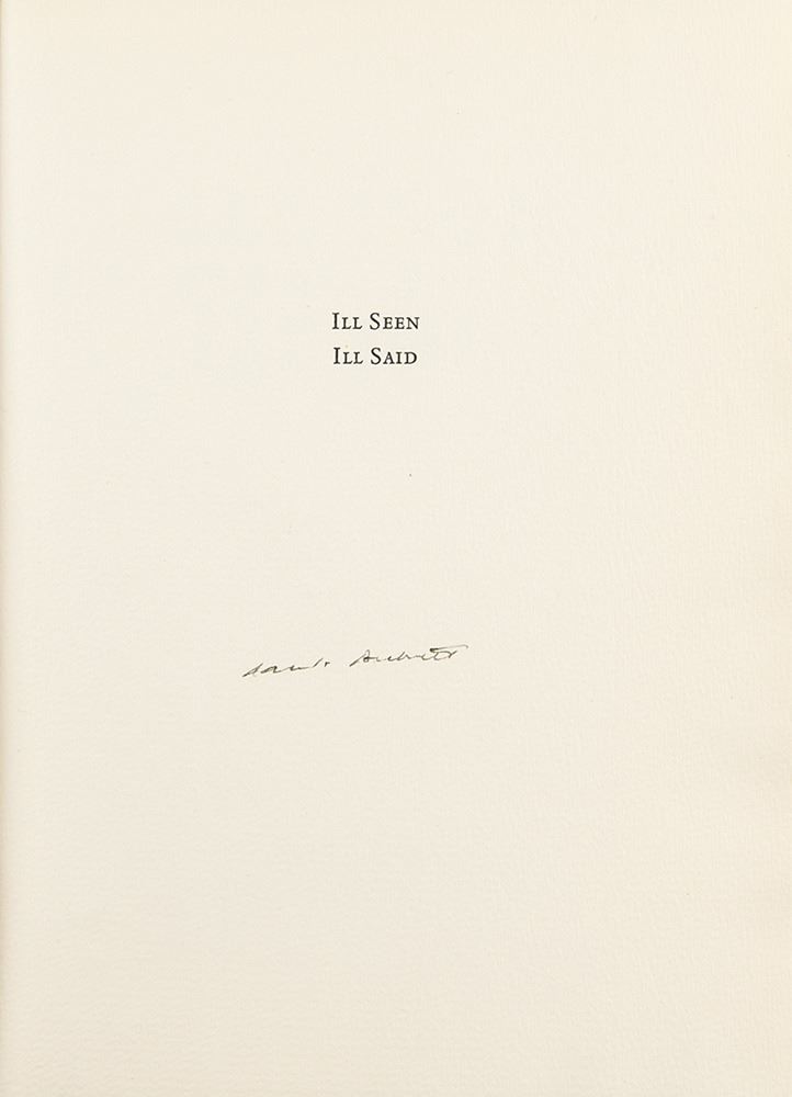 Signed book: Ill Seen Ill Said. Limited edition, numbered 150/299. Northridge, CA: Lord John Press, 1982. Hardcover quarter bound in gilt-stamped navy leather with blue marbled boards, 6.25 x 8, 45 pages. Diminutively signed on the half-title page in black ink by Samuel Beckett. In very fine condition.
