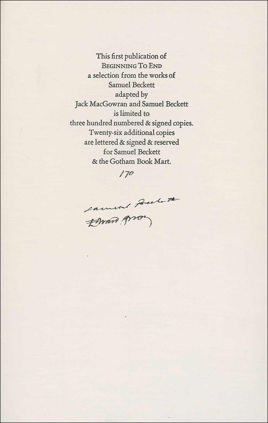 Signed book: Beginning to End. Limited first edition of 300 copies (this copy No. 170). NY: Gotham Book Mart, 1988. Hardcover, 6 x 9, 32 pages. Signed on the colophon page in black ink by both Samuel Beckett and Edward Gorey. In very fine condition.