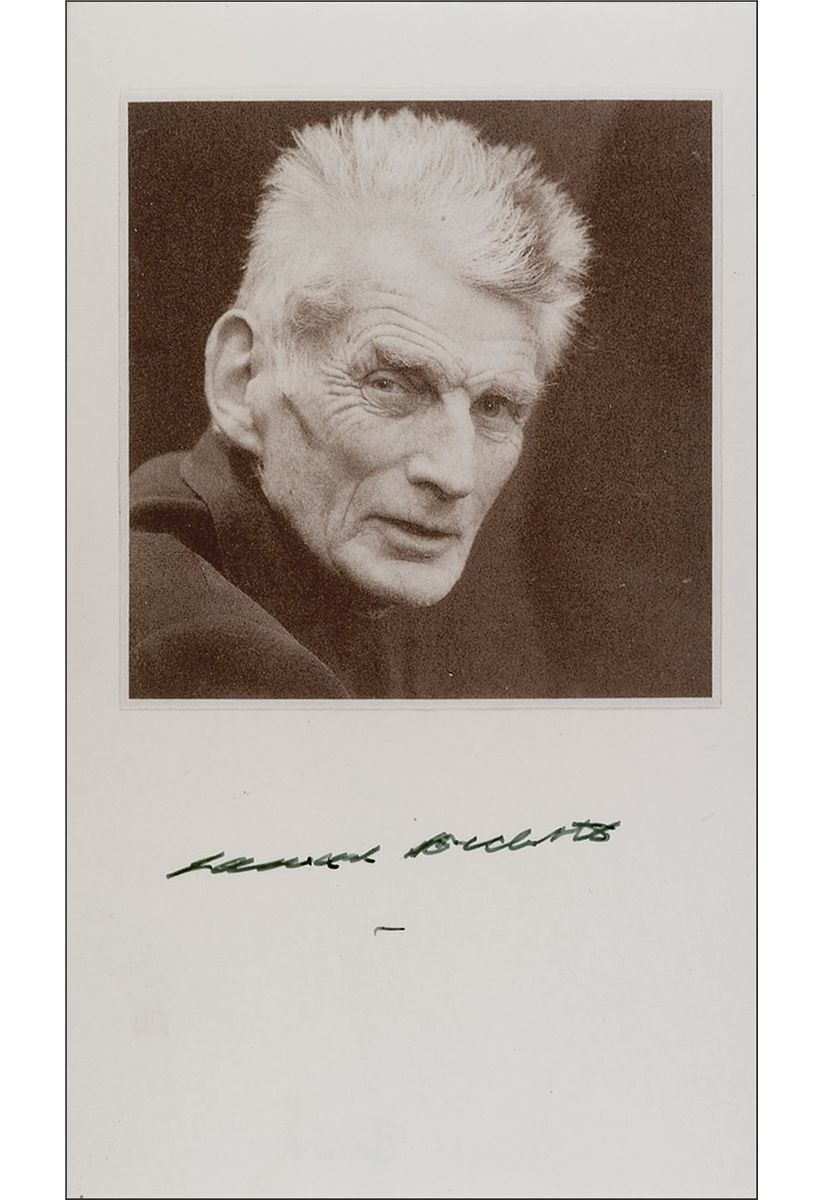 Irish avant-garde writer, dramatist, and poet (1906–1989). Satin-finish 3.5 x 6 photo, signed in the large lower border in black ink. In fine condition, with a few slight bends and creases to lower border.
