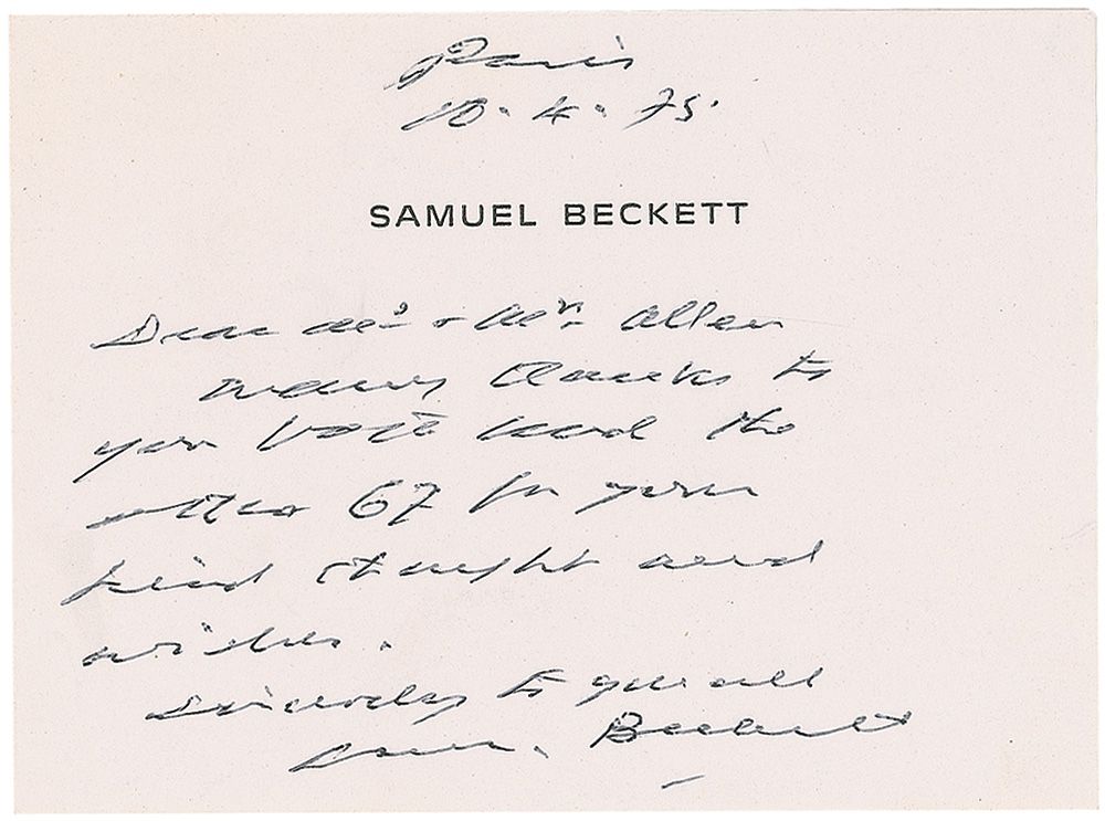 ANS, one page, 3.5 x 2.75, personal letterhead, October 4, 1975. Brief note of thanks. In part: “Many thanks to you both…for your kind thought and wishes.” In fine condition. Accompanied by the original mailing envelope addressed in Beckett’s hand.