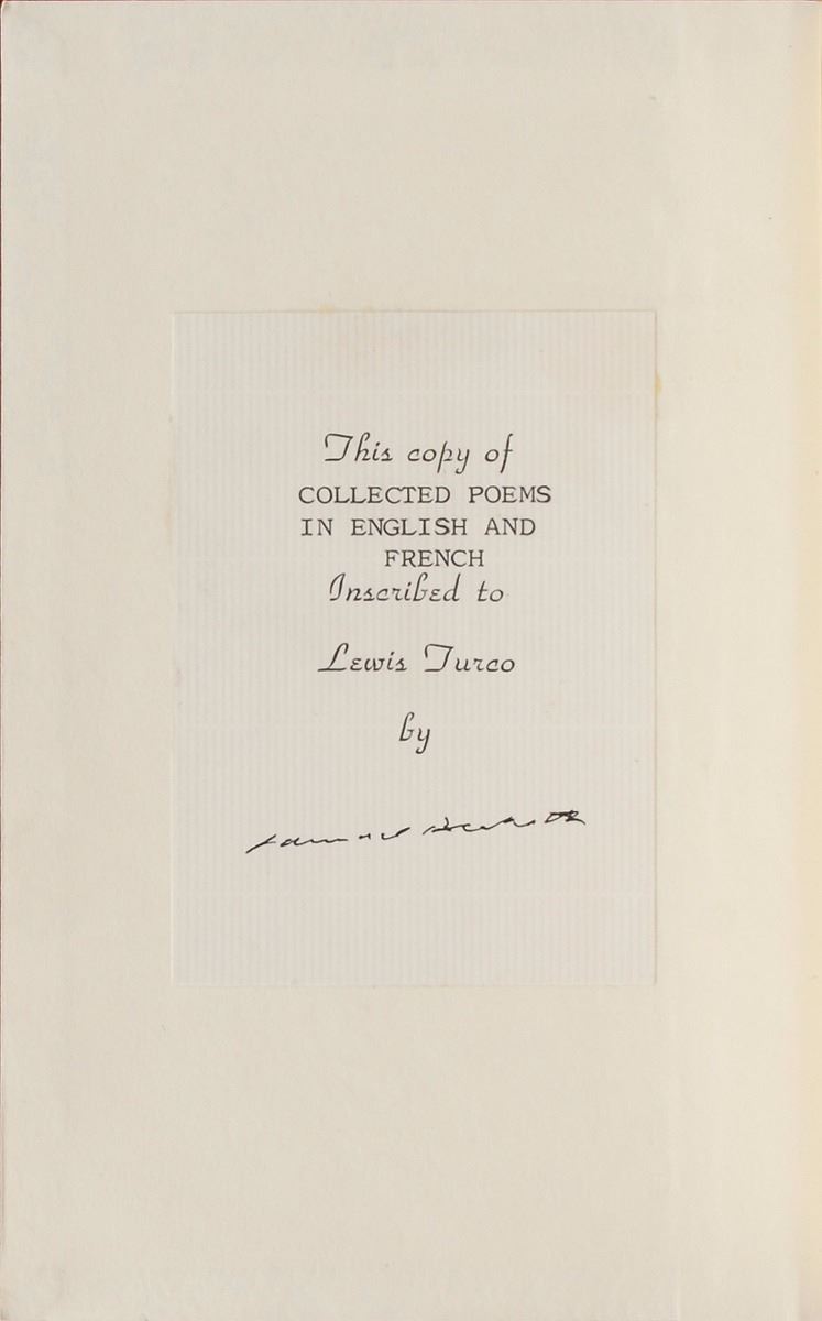 Signed book: Collected Poems in English and French. First edition. NY: Grove Press, 1977. Hardcover, 5.25 x 8.25, 147 pages. Signed on a bookplate affixed to the front pastedown in black ink, “Samuel Beckett,” and inscribed in type to Lewis Turco. In fine condition, with ownership signature to first free end page and blindstamp to title page.