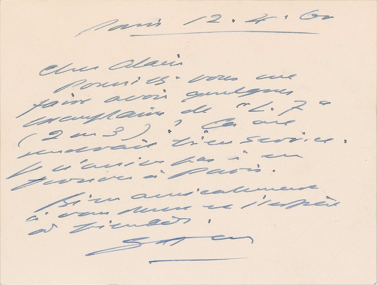 ALS in French, one page, 5.5 x 4.25, April 12, 1960. Letter to “Alain,” possibly Alain Bosquet, requesting copies of a book. In very fine condition.