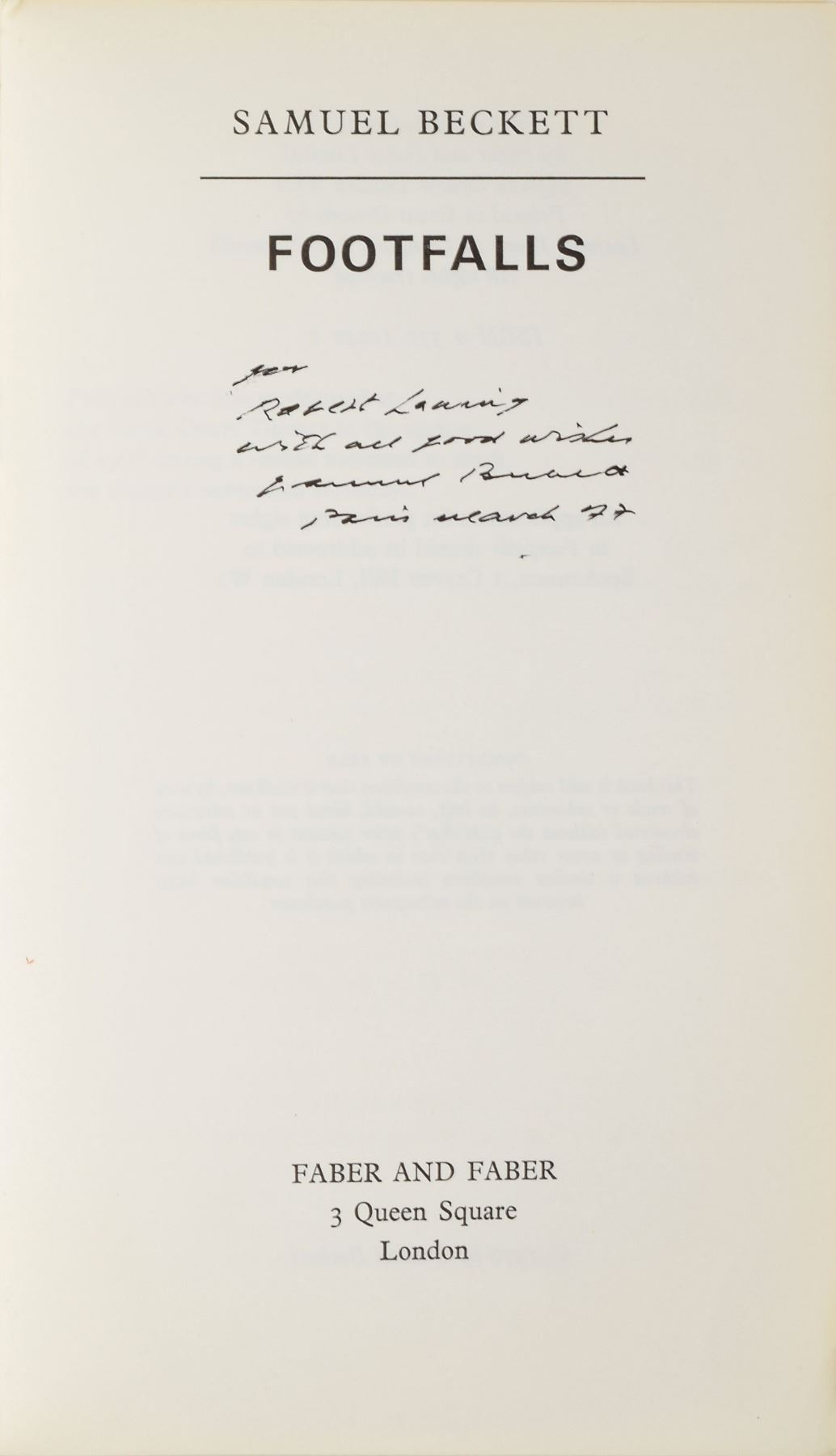 Signed book: Footfalls. First edition. London: Faber and Faber, 1976. Softcover, 4.75 x 7.75, 13 pages. Neatly signed and inscribed on the title page in black felt tip, "For Robert Lanning, with all good wishes, Samuel Beckett, Paris March 77." In fine condition. This short, two-character play was only published in softcover—a desirable, uncommon signed example of this obscure work.