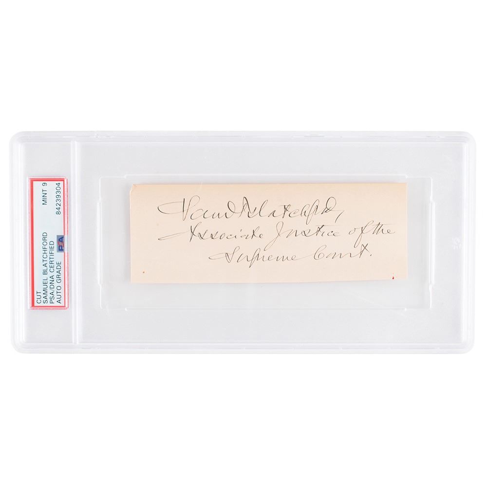 Ink signature, "Sam'l Blatchford, Associate Justice of the Supreme Court," on an off-white 5.75 x 2 sheet. In fine condition. Encapsulated in a PSA/DNA authentication holder, grading the autograph as "MINT 9."