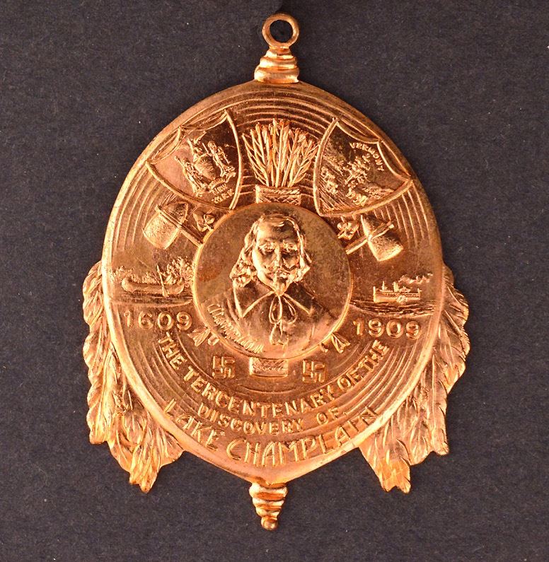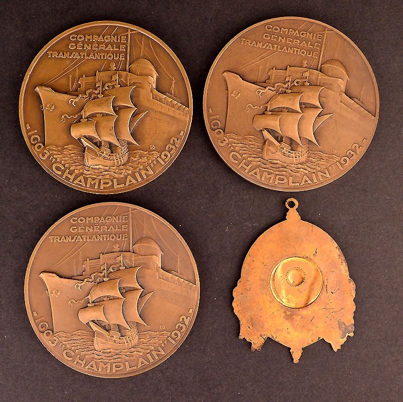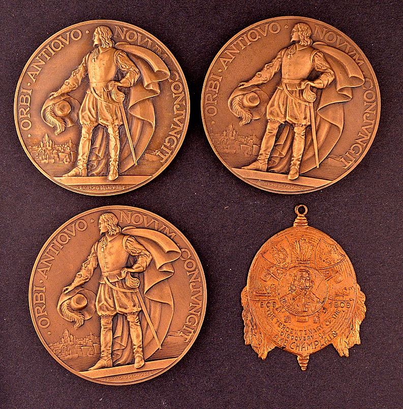 Fob, The Tercentenary of the discovery of Lake Champlain, 1609-1909, Champlain at centre, Ae, 47x53mm, by Whitehead & Hoag, VF; Companie Generale Transatlantique, Champlain, 1603 - 1932, Ae, 67mm, by Raymond Delamarre. Full figured rendition of Champlain viewing New France. EF, (3); Total of 4 medals.