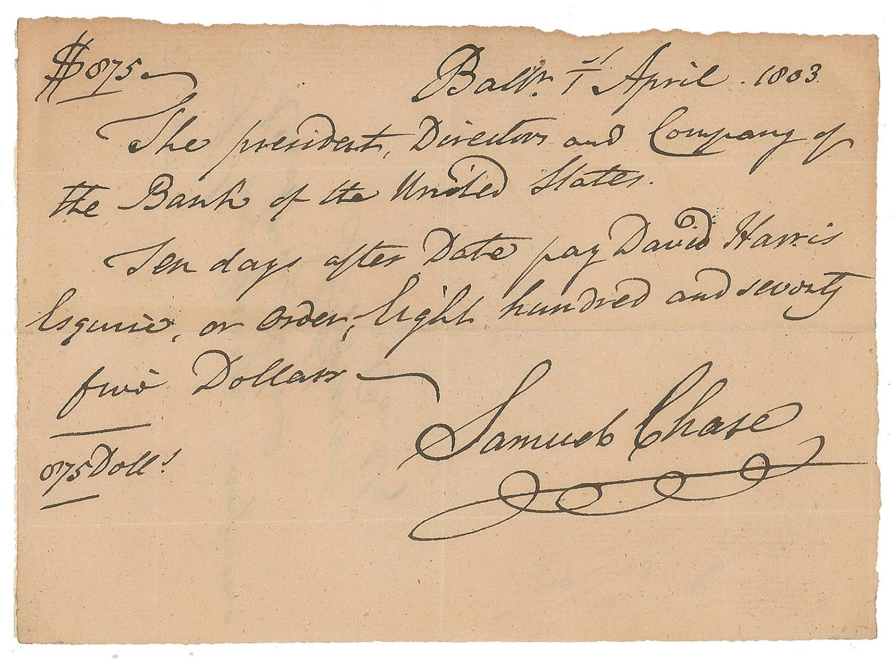ADS, one page, 7 x 5, April 1, 1803. Boldly handwritten pay draft, in full: "$875, The President, Director and Company of the Bank of the United States: Ten days after Date pay David Harris Esquire, or Order, Eight hundred and seventy five Dollars." In fine condition.