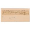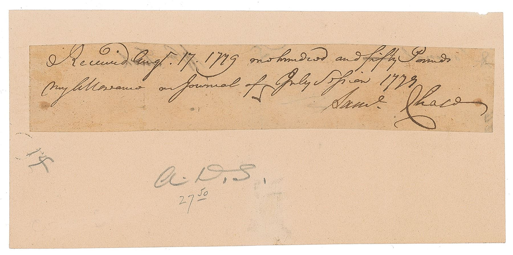 Revolutionary War–dated partial ADS signed "Sam'l Chase," one page, 6 x 1, August 17, 1779, in full: "Received Aug't 17, 1779, one hundred and fifty Pounds my allowance on Journal of July Session 1779." Affixed to a slightly larger card. In fine condition. In his 1995 reference History Comes to Life, Kenneth Rendell places Chase's autograph material into the 'rare' category among the Signers.