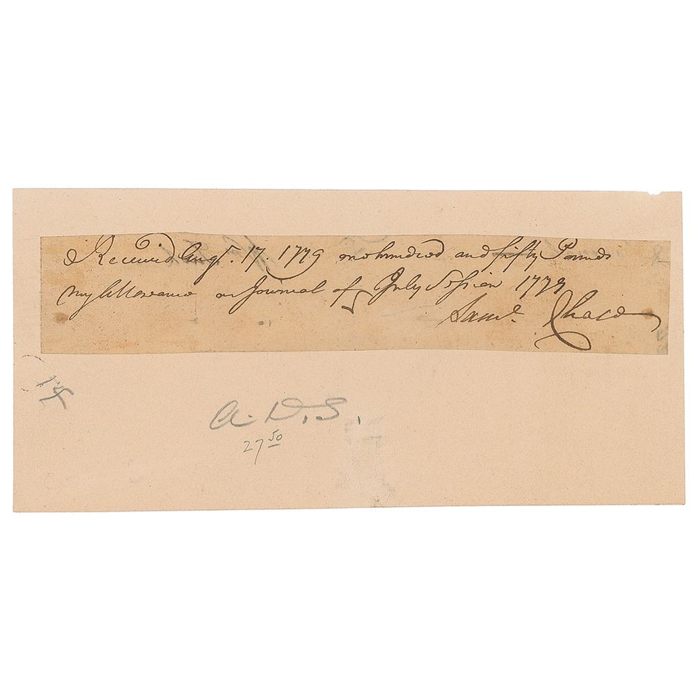 Revolutionary War–dated partial ADS signed "Sam'l Chase," one page, 6 x 1, August 17, 1779, in full: "Received Aug't 17, 1779, one hundred and fifty Pounds my allowance on Journal of July Session 1779." Affixed to a slightly larger card. In fine condition. In his 1995 reference History Comes to Life, Kenneth Rendell places Chase's autograph material into the 'rare' category among the Signers.
