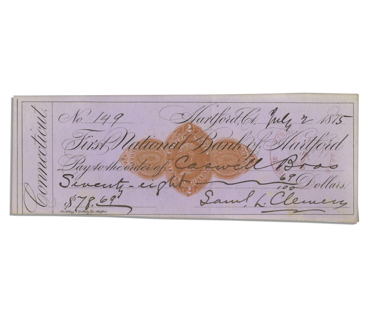 Mark Twain personal check signed in his given name, ''Saml L. Clemens''. First National Bank of Hartford check is dated 2 July 1875 and made out entirely in Clemens' hand to ''Caswell Bros'' in the amount of $78.69. Endorsed on verso by Caswell. Partially printed check on pale lavender paper measures 7.75'' x 3''. Trimming to bottom edge evident on the left and some light staining to lower right, else near fine.