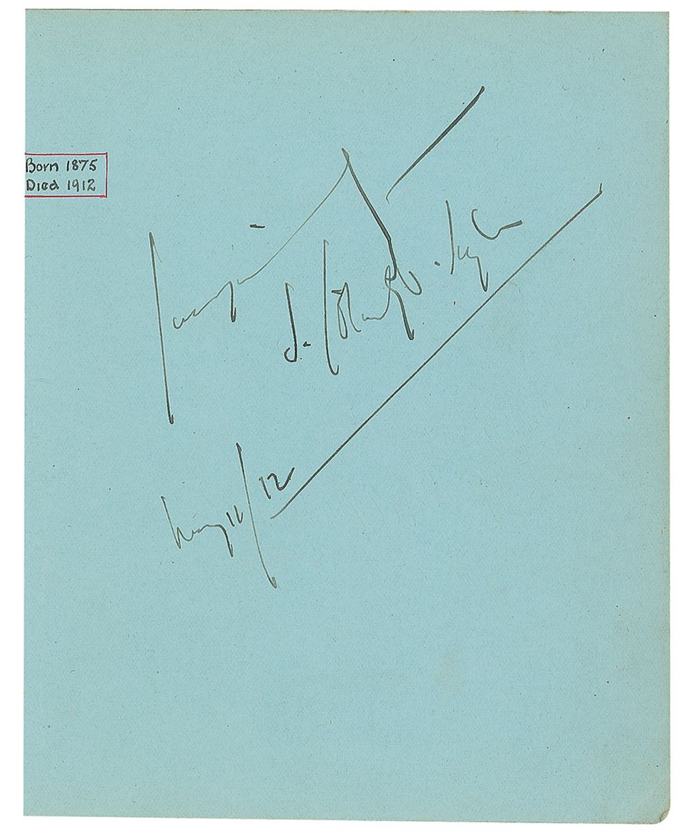 Pioneering and highly regarded Afro-British musician (1875–1912), known as the ‘Black Mahler,’ who takes a place among the earliest black composers to work in a classical idiom. Vintage ink signature, “Sincerely, S. Coleridge-Taylor, May 11/12,” on a blue 5 x 6 album page with a collector’s notation to the upper left. In fine condition.