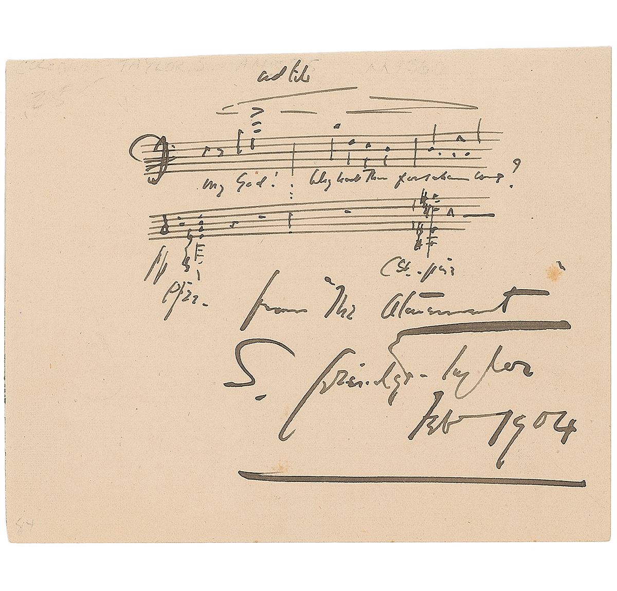 Pioneering and highly regarded Afro-British musician (1875–1912), known as the ‘Black Mahler,’ who takes a place among the earliest black composers to work in a classical idiom. AMQS on an off-white 3.5 x 4.5 sheet, signed below in ink, “S. Coleridge-Taylor, Feb 1904.” Coleridge-Taylor pens three bars of music and lyrics, identifying the piece below, “From ‘The Atonement.’” In fine condition.