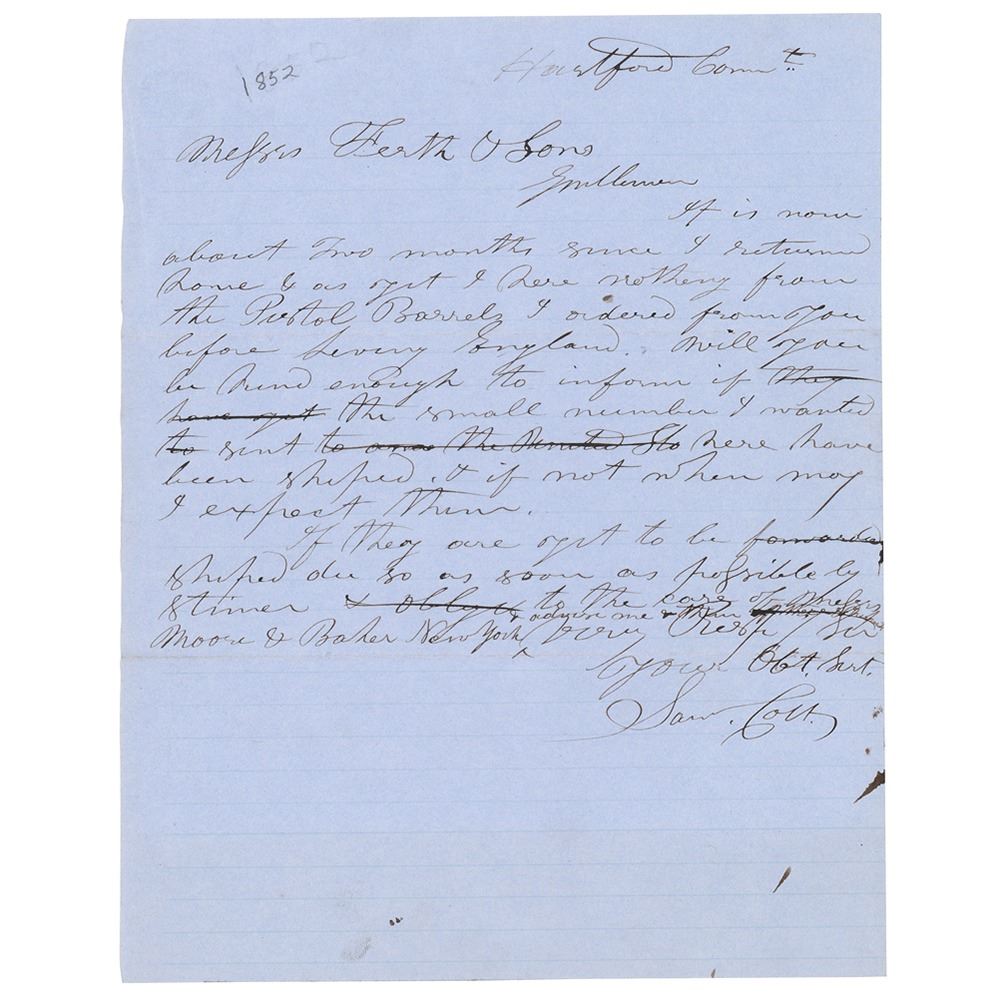 ALS signed “Sam'l Colt,†one page, 7.75 x 9.75, no date but annotated 1852. Handwritten letter from Hartford to Firth & Sons, regarding a shipment of pistol barrels. In part: "It is now about two months since I returned home & as of yet I here [sic] nothing from the Pistol Barrels I ordered from you before leaving England. Will you be kind enough to inform if the small number I wanted sent here have been shipping, & if not when may I expect them." In fine condition.