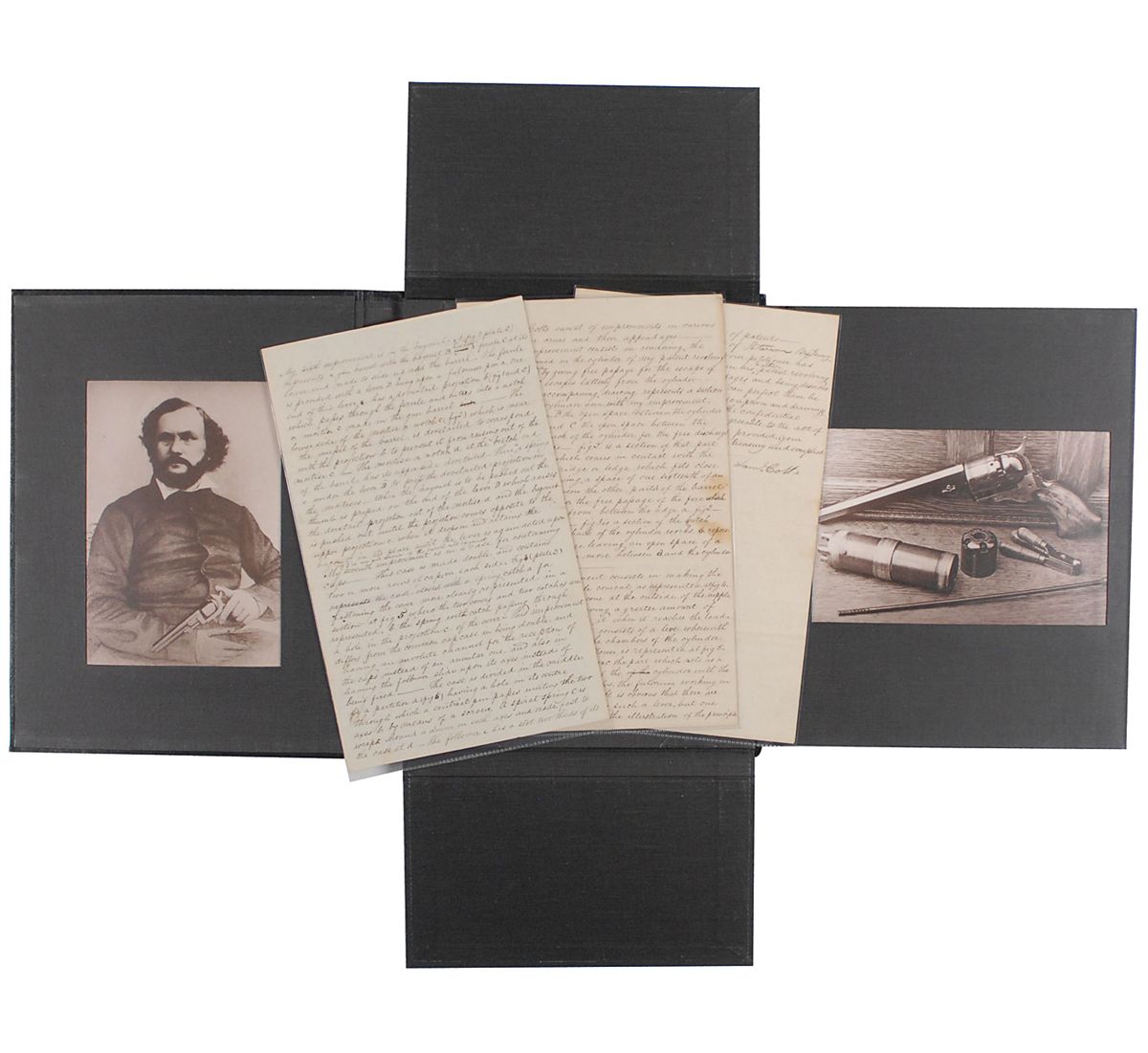 Deeply interested in the young Samuel Colt’s evolving design for a revolver, Henry Ellsworth used his position as the first Commissioner of the US Patent Office to jump-start what would become the mighty Colt empire. Helping Colt secure US Patent No. 138 (later renamed 9430X) in 1836, he provided him with the support he needed to raise nearly $200,000 from investors to incorporate the Patent Arms Manufacturing Company of Paterson, New Jersey, and begin manufacturing the Paterson pistol. The diligent inventor continuously worked on improving his design, and though not yet ready to file a new patent, he wrote to Ellsworth to file a caveat “securing his rights until he can perfect them.” This collection of draft documents, offering detailed description of some early modifications to his revolver, which would appear in the August 29, 1839, patent #1304—including the 4th improvement for bullet molds, the 5th for the powder flask, and the 7th for improvement caps—captures the incessant drive for improvement that made Colt one of the finest weapons manufacturers of all time. An incredibly rare collection with content of the utmost desirability.