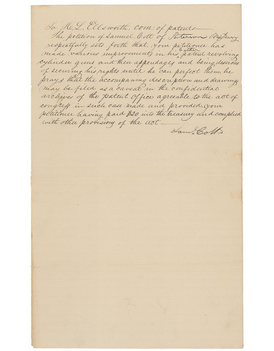 First is a manuscript DS signed “Saml Colt,” one page, 8 x 13, no date. In full: “The petition of Samuel Colt of Paterson New Jersey respectfully sets forth that your petitioner has made various improvements in his & other patent revolving cylinder guns and their appendages, and being desirous of securing his rights until he can perfect them, he prays that the accompanying description and drawing may be filed as a caveat in the confidential archives of the patent office agreeable to the act of congress in such case made and provided your petitioner having paid $20 into the treasury and complied with other provisions of the act.”