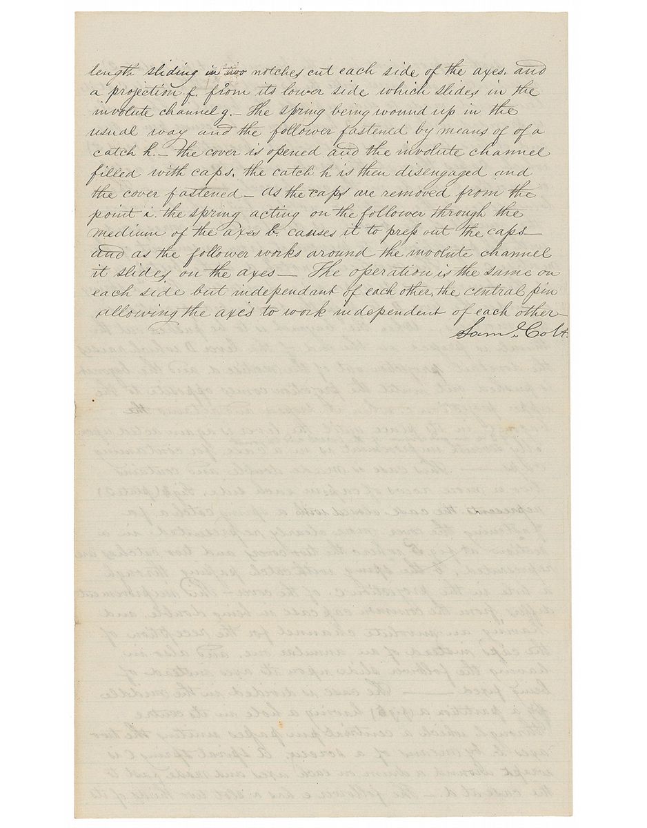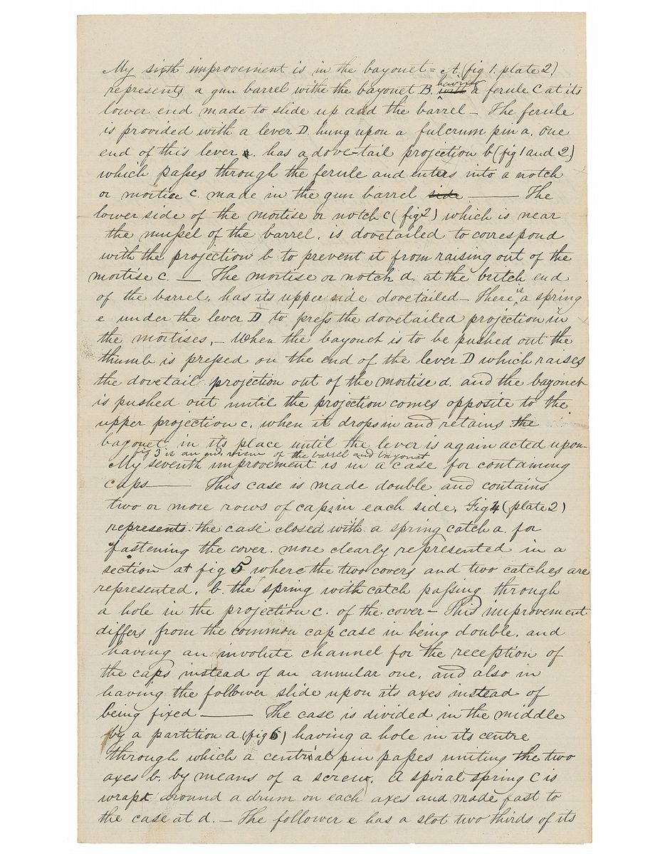 Third is a continuation manuscript DS signed “Saml Colt,” one page both sides adjoining sheets, 8 x 13, no date. In part: “My sixth improvement is in the bayonet = A (fig 1. Plate 2) represents a gun barrel with the bayonet B having a ferule C at its lower end made to slide up and [down] the barrel…The mortise or notch d. at the britch end of the barrel has its upper side dovetailed… My seventh improvement is in a case for containing caps…This improvement differs from the common cap case in being double, and having an involute channel for the reception of the caps instead of an annular one, and also in having the follower slide upon its axes instead of being fixed…the cover is opened and the involute channel filled with caps, the catch h is then disengaged and the cover fastened…The operation is the same on each side but independent of each other, the central pin allowing the axes to work independent of each other.” Colt has made a few corrections in his own hand, including: “Fig 3 is an end view of the barrel and bayonet.”