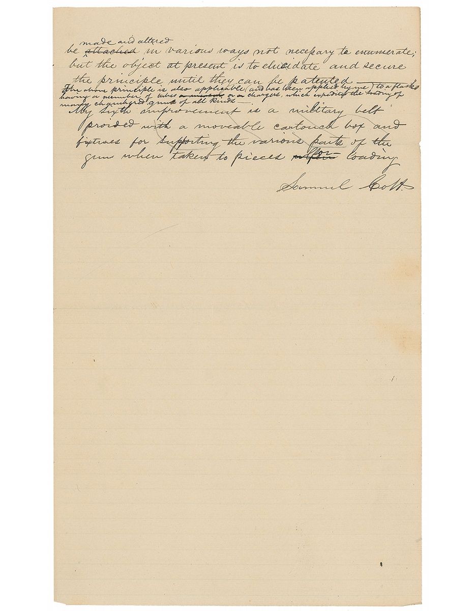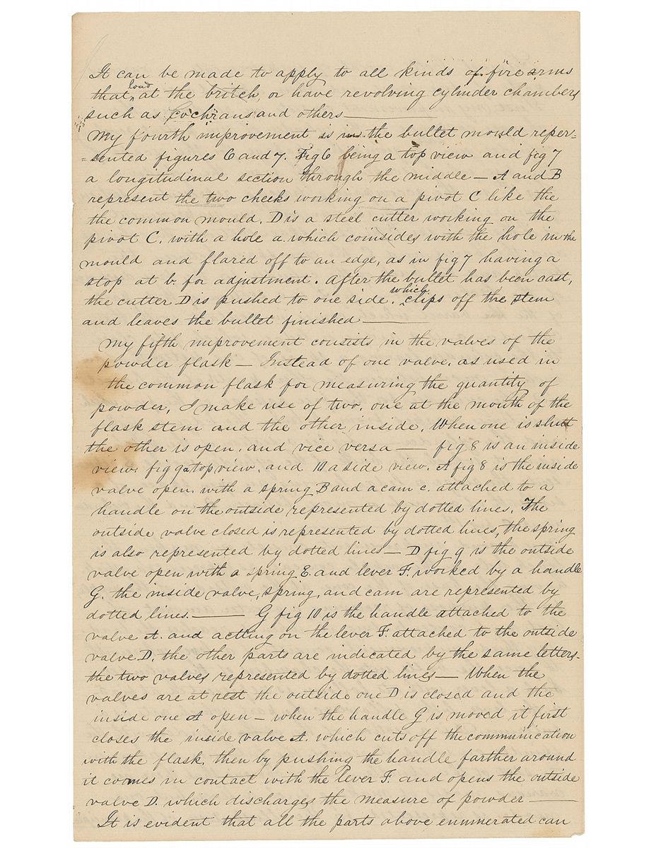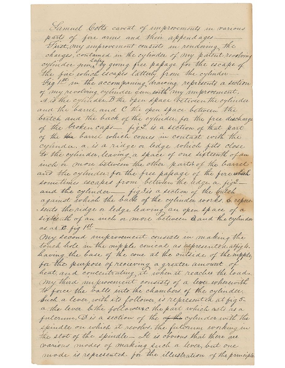 Second is a manuscript DS signed “Samuel Colt,” three pages on two adjoining sheets, 8 x 13, no date. In part: “Samuel Colts caveat of improvements in various parts of fire arms and their appendages—First my improvement consists in rendering the charges, contained in the cylinder of my patent revolving cylinder gun safe by giving free passage for the escape of the fire which escapes latterly from the cylinder…My second improvement consists in making the touch hole in the nipple conical…having the base of the cone at the outside of the nipple, for the purpose of receiving a greater amount of heat and concentrating it when it reaches the load. My third improvement consists of a lever wherewith to force the balls into the chambers of the cylinder…It is obvious that there are various modes of making such a lever, but one mode is represented for the illustration of the principle. It can be made to apply to all kinds of fire arms that load at the britch or have revolving cylinder chambers such as cochrans and others—My fourth improvement is in the bullet mould…After the bullet has been cast, the cutter D is pushed to one side which clips off the stem and leaves the bullet finished. My fifth improvement consists in the valves of the powder flask—Instead of one valve, as used in the common flask for measuring the quantity of powder, I make use of two, one at the mouth of the flask stem and the other inside. When one is shut the other is open, and vice versa…It is evident that all the parts above enumerated can be made and altered in various ways not necessary to enumerate; but the object at present is to elucidate and secure the principle until they can be patented.” At the conclusion, Colt has crossed out a short paragraph and added the following in his own hand: “The above principle is also applicable and has been applied by me to a flask having a number of tubes or chargers which expedite the loading of many chambered guns of all kinds.”