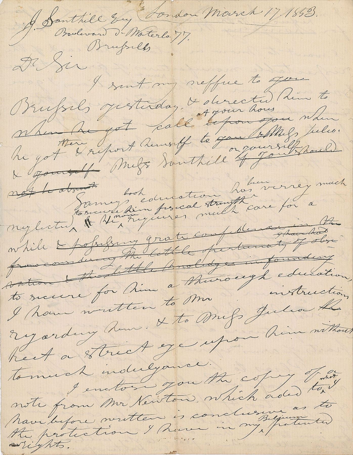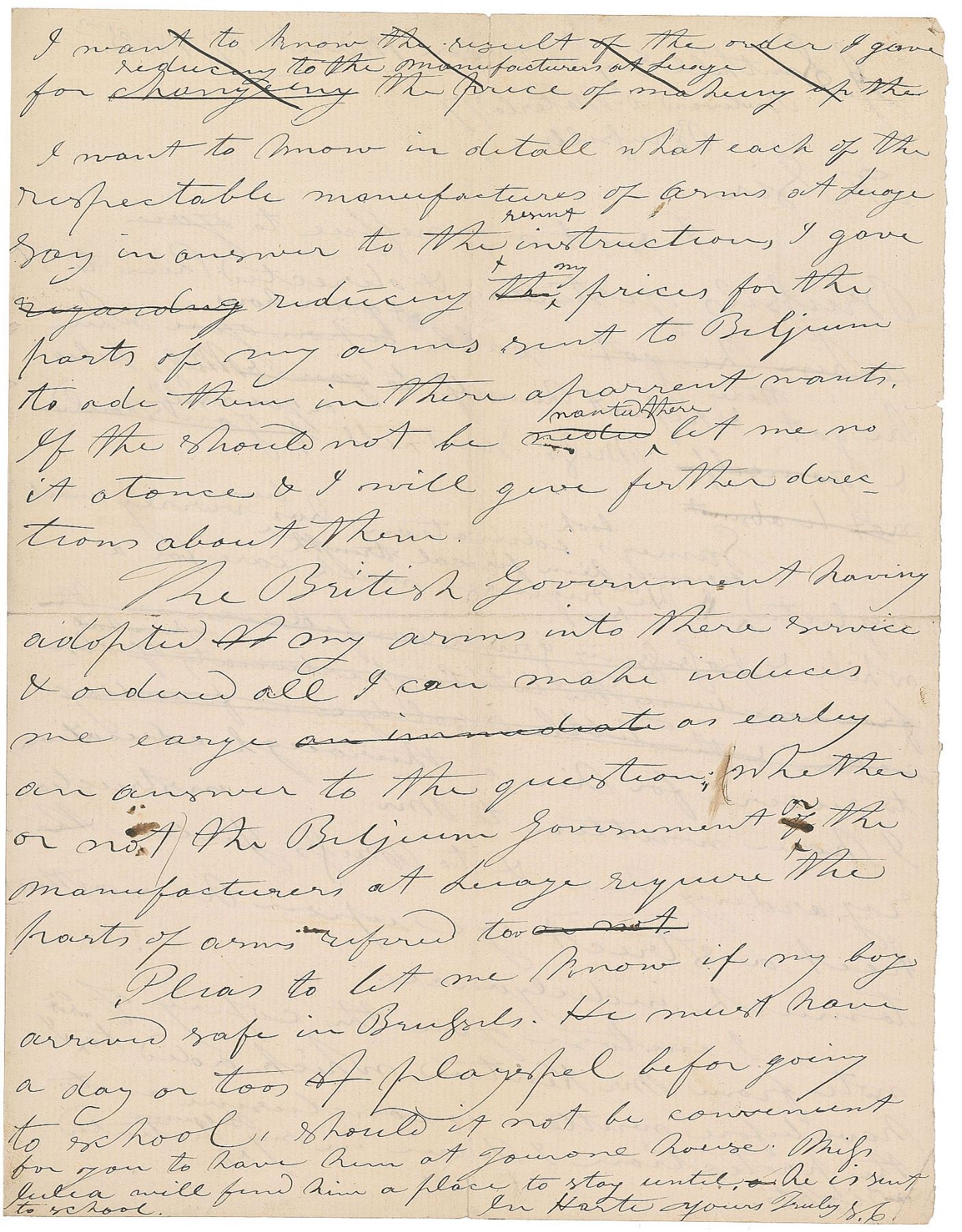 ALS signed “S. C.,” one page both sides, 8.25 x 10.75, March 17, 1854. Heavily edited draft of a letter addressed to J. Santhill in Brussels, in part: "I enclose you the copy of a note from Mr. Newton, which added to what I have before written, is conclusive as the protection I have in my Belgium patented rights. I want to know in detail what each of the respectable manufacturers of arms at Leige say in answer to the recent instructions I gave reducing my prices for the parts of my arms sent to Belgium to add them in the aparrent [sic] wants. If they should not be wanted there let me know it at once & I will give further directions about them. The British Government having adopted my arms into their service & ordered all I can make induces me…as early an answer to the question, whether or not the Belgium Government or the manufacturers at Liege require the parts of arms refired too." In fine condition. Colt was an expert promoter of his innovative firearms, and in 1854 the British Admiralty ordered 4,000 Navy Model Colt revolvers. Although it took him another year to convince the British Army to do the same—they ordered 5,000 pistols for Army issue in 1855—he was already promoting his guns as if they were the staple of the British military. A fantastic letter revealing Colt's keen instincts as a businessman—both in marketing and in the protection of his patent.
