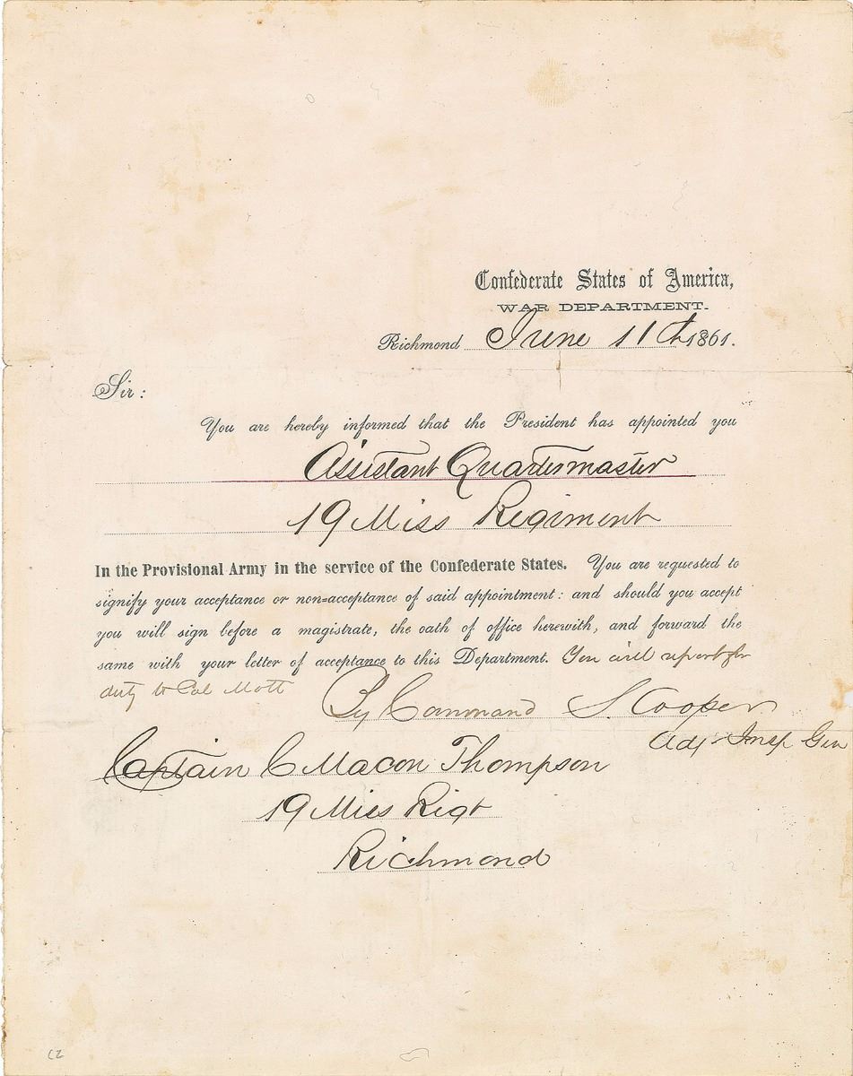 Highest-ranking Confederate general (1798–1876) during the Civil War. Partly-printed DS, signed “S. Cooper, Adj. Insp. Gen.,” one page, 7.75 x 9.75, June 11, 1861. Official document issued by the Confederate States of America War Department to Captain C. Macon Thompson of Richmond, in part: “You are hereby informed that the President has appointed you Assistant Quartermaster, 19 Miss. Regiment, In the Provisional Army in the service of the Confederate States.” Removably encapsulated in a mylar sleeve. In very good to fine condition, with scattered overall soiling.