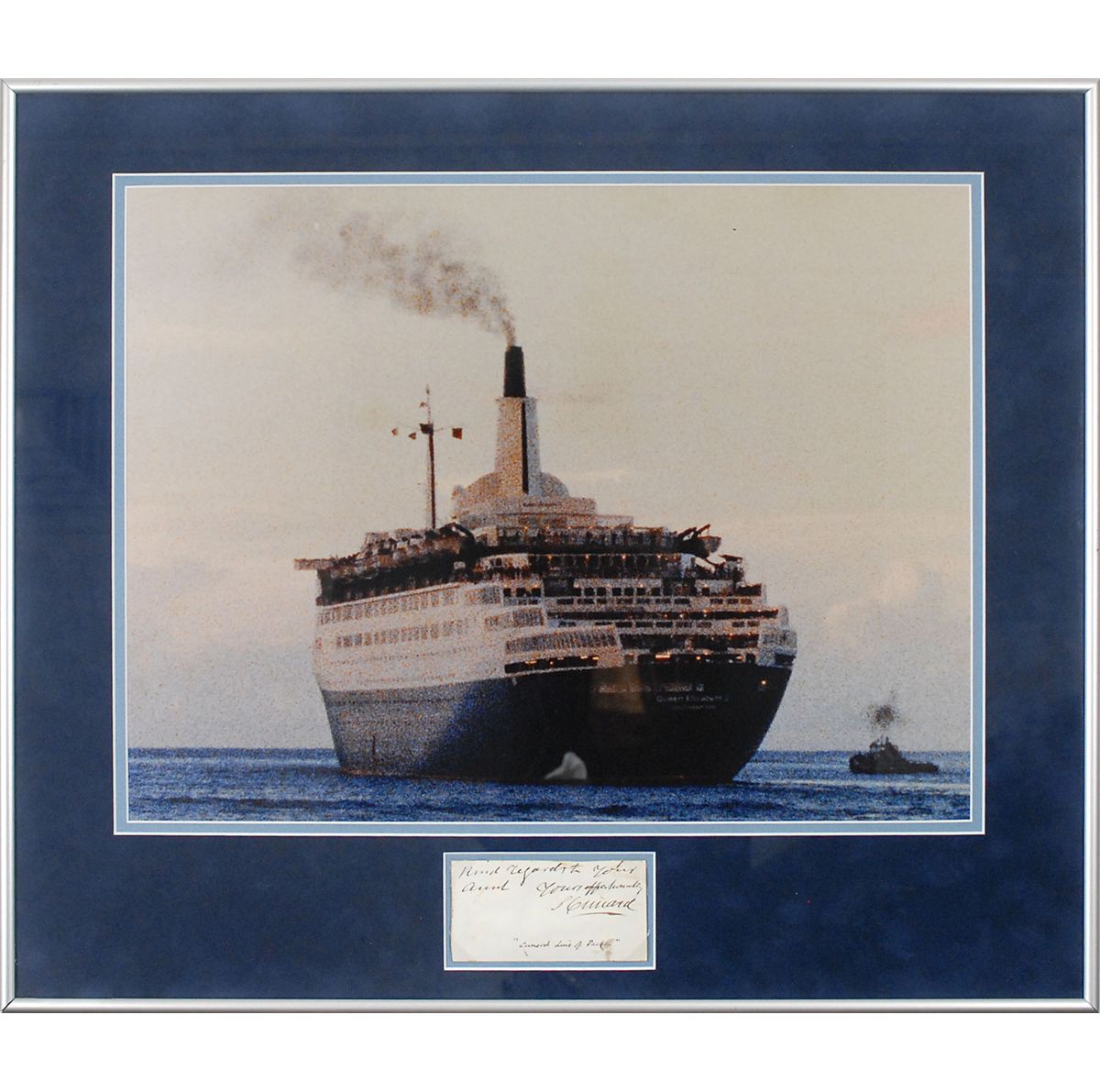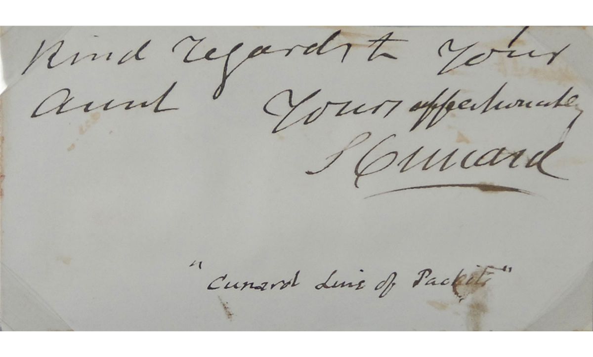Canadian-born British shipping magnate (1787–1865) who founded the pioneering steamship line that still bears his name. Scarce ink signature, “Kind regards to your aunt. Yours affectionately, S. Cunard,” on an off-white slip, clipped from the closing of a letter, with “Cunard Line of Packets,” written at the bottom in a collector’s hand. Double-suede-matted and framed with a large portrait of the QE2 leaving Papeete, Tahiti, to an overall size of 24.75 x 21. In fine condition, with a few small brushes and spots of light soiling. Oversized.