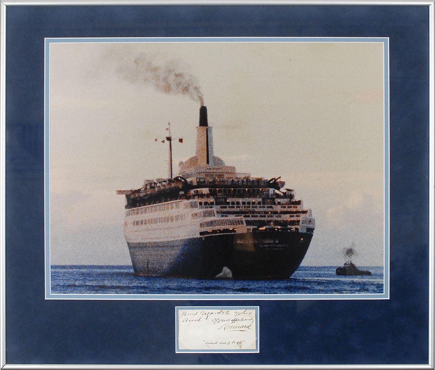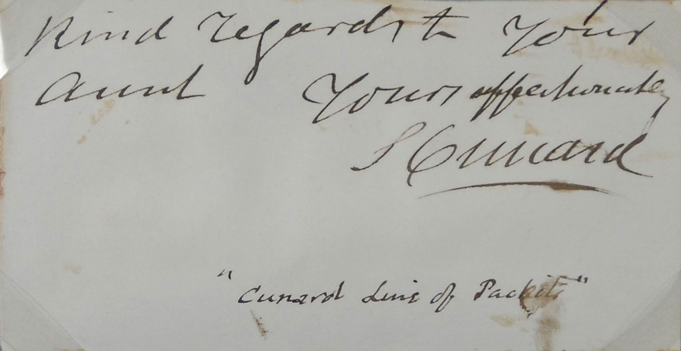 Canadian-born British shipping magnate (1787–1865) who founded the pioneering steamship line that still bears his name. Scarce ink signature, “Kind regards to your aunt. Yours affectionately, S. Cunard,” on an off-white slip clipped from the close of a letter, with “Cunard Line of Packets,” written at the bottom in a collector’s hand. Double-suede-matted with a large photo of the QE2 leaving Papeete, Tahiti, to an overall size of 24.5 x 20.75. In fine condition, with a few small brushes and spots of light soiling.