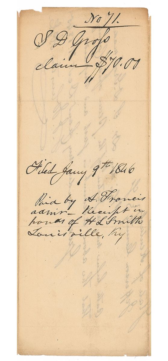 American academic trauma surgeon (1805–1884). He is the subject of Thomas Eakins’ painting, The Gross Clinic, one of the most significant American paintings of the 19th century. Autograph document, signed in the text, “S. D. Gross,” one page, 7.5 x 10, December 29, 1845. Gross writes, “the Estate of the late Dr. James Spence to S. D. Gross, Dr. For professional services during Dr. Spence's long illness- $70.00.” The middle portion of the page is completed by a Justice of the Peace, with Gross’s letter at the bottom of the page, signed “S. D. Gross.” Letter reads, “It is true that physicians do not generally charge for attendance upon each other. There are, however, exceptions to all rules. Favors are reciprocal. Dr. Spence was in good circumstances & died without any family. Had it been otherwise, I should certainly not have presented any account for professional services.” In very good condition, with a bit of scattered paper loss to vertical edges, partial separations along fragile horizontal folds, and some mild show-through from docketing on reverse.