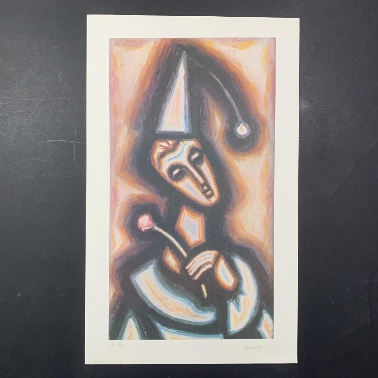 Samuel Dukshi's "The Jester" limited edition print, signed lower right and numbered 13/50 AP. This piece is of a jester wearing a pointed hat, holding a single rose. This piece is in excellent condition.