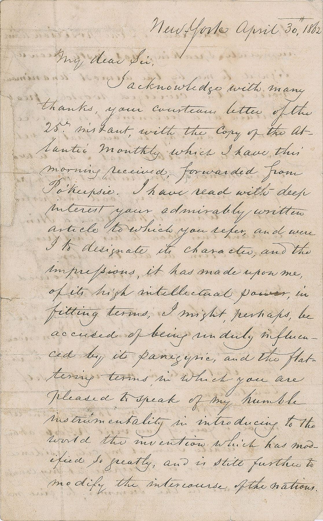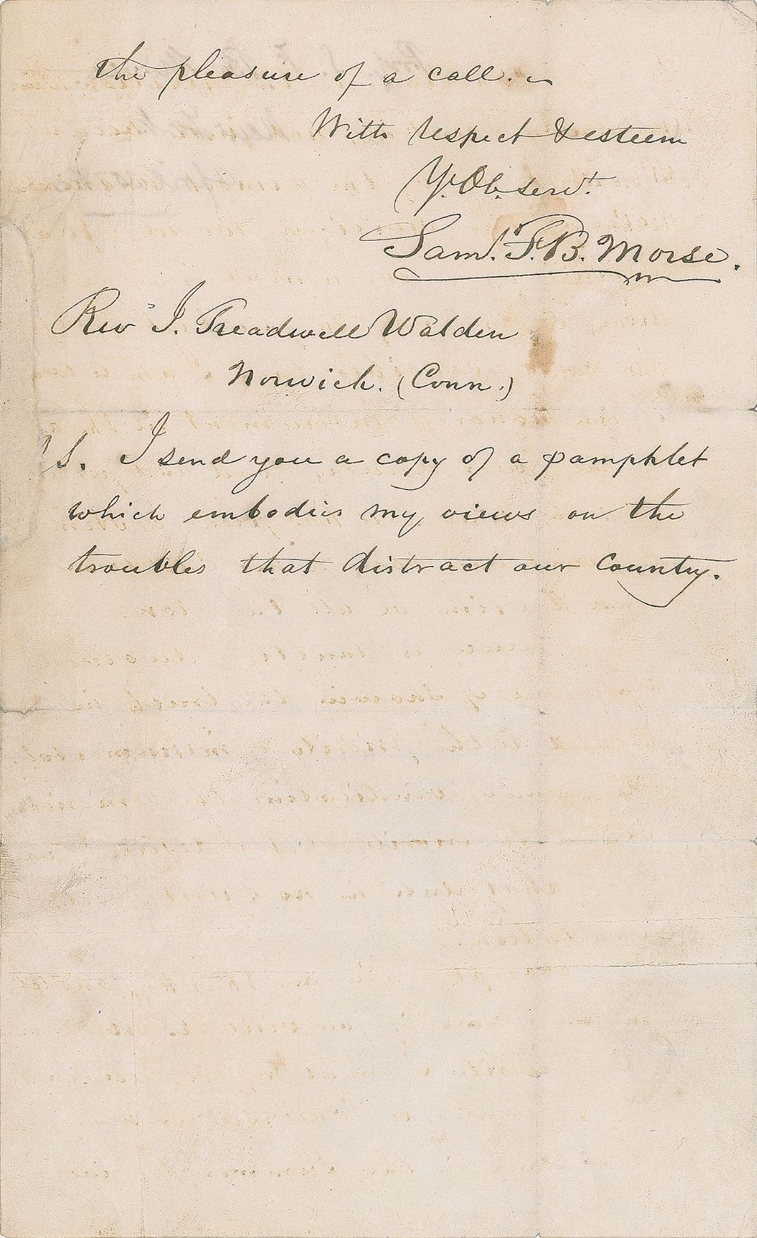 ALS signed “Sam’l F. B. Morse,” three pages on two adjoining sheets, 5 x 8, April 30, 1862. Letter to Minister J. Treadwell Walden of Norwich, Connecticut. In part: “I acknowledge with many thanks, your courteous letter of the 25th instant, with the copy of the Atlantic Monthly which I have this morning received, forwarded from Po’keepsie. I have read with deep interest your admirable written article to which you refer, and were I to designate its character, and the impressions, it has made upon me, or its high intellectual power, in fitting terms, I might, perhaps, be accused of being unduly influenced by its panegyric, and the flattering terms, in which you are pleased to speak of my humble instrumentality in introducing to the world the invention which has modified so greatly, and is still further to modify the intercourse of nations. While conscious of the position which humanely speaking, has justly been assigned to me by the almost unanimous voice of the civilized world (Great Britain as a Government is an exception), I can say to you that I yet am fully sensible that I am a we[ak] if honored instrument in the han[ds] of the Giver of every good and perfec[t] gift, by whom it has pleased Him to grant this boon to his children, and to Him be all the glory. A duty is doubtless devolved upon me of showing the truth in regard to the priority of instrumentalities, and of vindicating the American claim to priority, yet I desire to perform that duty in no spirit of self-laudation…P.S. I send you a copy of a pamphlet which embodies my views on the troubles that distract our country.” In very good to fine condition, with light overall soiling, several intersecting folds, and an old repair to paper loss on the hinge, lightly affecting a few words of text.