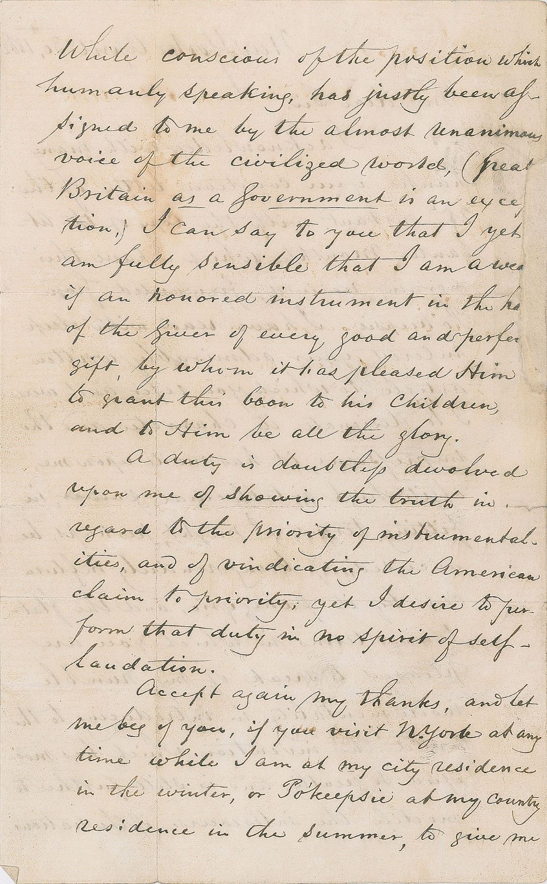 Morse’s mention of “Great Britain as a Government is an exception” is in reference to the ongoing dispute with English inventor Charles Wheatstone, who, along with William Cooke, invented an electrical needle telegraph around the same period as Morse. In 1851, the Morse telegraphic apparatus was officially adopted as the standard for European telegraphy, with only the United Kingdom opting to employ the use of Wheatstone and Cooke’s needle telegraph. The religious subtext of the letter suitably echoes Morse’s famous first telegraph from the basement of the US Capitol on May 24, 1844—‘What hath God wrought?’