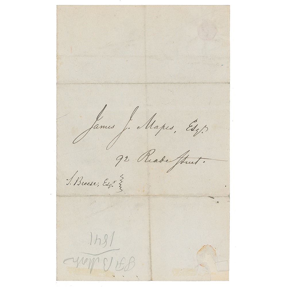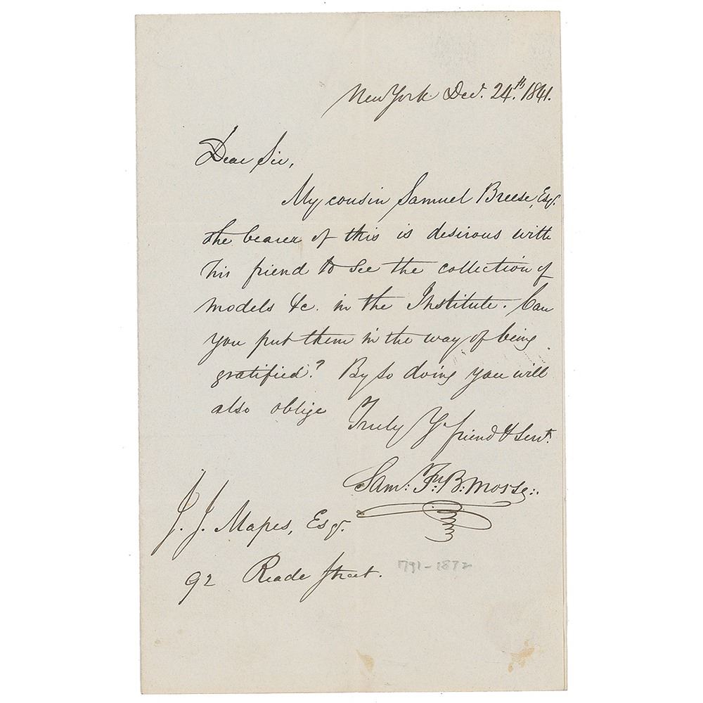 ALS signed ‰ÛÏSam: F: B: Morse,‰Û one page, 5 x 7.75, December 24, 1841. Letter to chemist James J. Mapes, in part: "My cousin Samuel Breese, Esq. the bearer of this is desirous with his friend to see the collection of models &c in the Institute. Can you put them in the way of being gratified?" In fine condition.