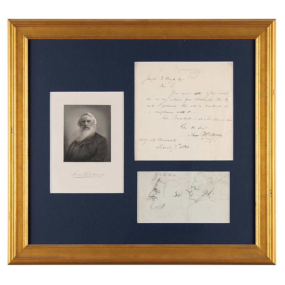 ALS signed “Sam. F. B. Morse,†one page, 7.75 x 7.75, March 7, 1838. Addressed from "N. Y. City University," a handwritten letter to Joseph B. Boyd, in full: “Your request of the 15th Jany reached me on my return from Washington this day, and I presume this will be considered as a compliance with it. Col. Trumbull is at New Haven Conn.†Another hand has added to the top in pencil, “(only 1 sheet) of sketch,†which alludes to an accompanying sheet of graphite drawings that is attributed to Morse. Unsigned, the sheet contains sketches of the faces of two men in profile and a curved tool or blade. Both the letter and sketch sheet are archivally matted and framed with an engraved portrait (bearing a facsimile signature) to an overall size of 21.5 x 19.5. In fine condition.