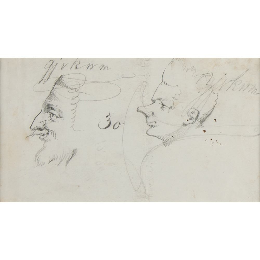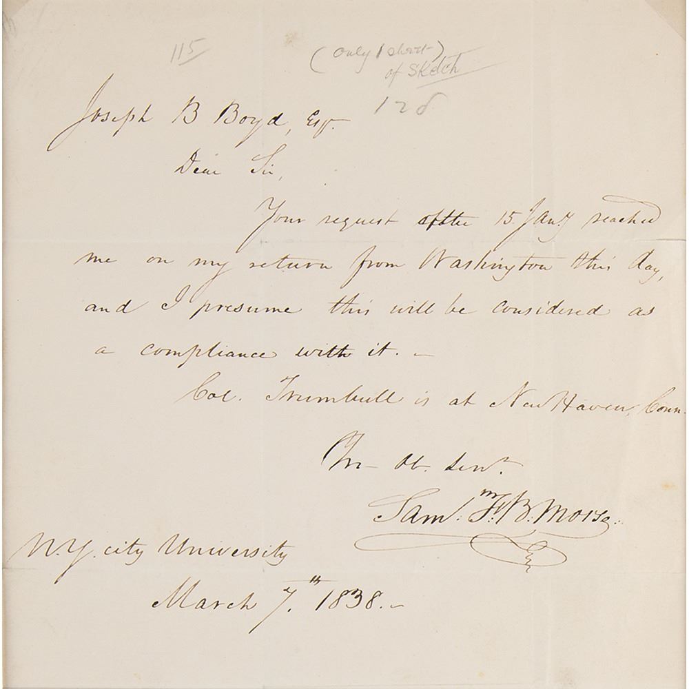 ALS signed “Sam. F. B. Morse,” one page, 7.75 x 7.75, March 7, 1838. Addressed from "N. Y. City University," a handwritten letter to Joseph B. Boyd, in full: “Your request of the 15th Jany reached me on my return from Washington this day, and I presume this will be considered as a compliance with it. Col. Trumbull is at New Haven Conn.” Another hand has added to the top in pencil, “(only 1 sheet) of sketch,” which alludes to an accompanying sheet of graphite drawings that is attributed to Morse. Unsigned, the sheet contains sketches of the faces of two men in profile and a curved tool or blade. Both the letter and sketch sheet are archivally matted and framed with an engraved portrait (bearing a facsimile signature) to an overall size of 21.5 x 19.5. In fine condition.