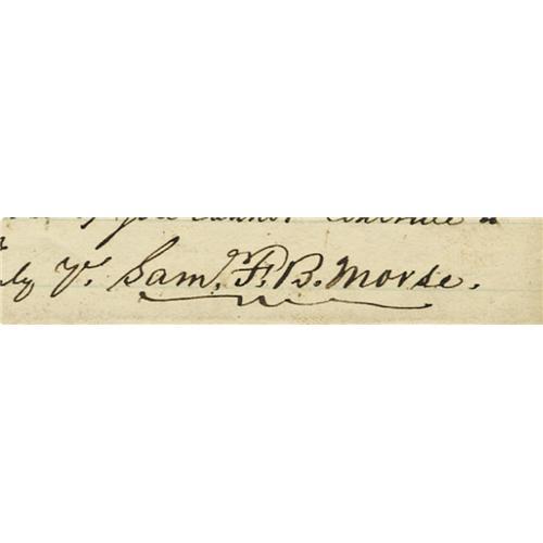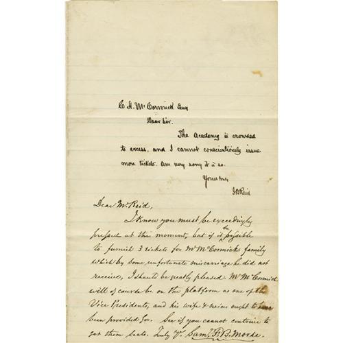 <B>Samuel F.B. Morse Autograph Letter Signed <I>"Saml F.B. Morse,"</B></I></B></I> one page, 5" x 8". New York, 1871 . An <B>ALS <I>"J.D. Reid"</B></I> to Cyrus H. McCormick,</B></I> the inventor of the reaper, is on the top half of this page; in full, <I>"Dear Sir. The Academy is crowded to excess and I cannot conscientiously issue more tickets. Am very sorry it is so."</B></I> When McCormick received this letter from Reid, he sent it to Morse who penned a letter to Reid beneath it. In full, <I>"I know you must be exceedingly pressed at the moment, but if it be possible to furnish 3 tickets for Mr McCormicks family which by some unfortunate miscarriage he did not receive, I should be greatly pleased. Mr. McCormick will of course be on the platform as one of the Vice Presidents, and his wife & nieces ought to have been provided for. See if you cannot contrive to get them seats."</B></I> James D. Reid was chairman of the Morse Testimonial Fund. In 1870, a statue of Samuel F.B. Morse was proposed by the telegraph operators of the United States and Canada. Reid had arranged for it to be erected in Central Park in New York City. On the afternoon of June 10, 1871, with 80-year-old Samuel F.B. Morse as the honored guest, the inaugural ceremonies were held in Central Park for the unveiling of the seven-foot high bronze statue designed by Byron M. Pickett. That evening, a reception was held at the Academy of Music. McCormick was one of the Vice Presidents of the inaugural committee. One of the addresses was delivered by Reid who spoke on behalf of the "Ladies of the Telegraph." The June 11, 1871, issue of <I>The New York Times</B></I> reported that "The Academy of Music was filled to overflowing," most assuredly including the McCormick ladies. Years earlier, James D. Reid (1819-1901) had been Superintendent of the Atlantic and Ohio Telegraph Company. In 1856, when Western Union began to absorb the individual lines, Reid was made Superintendent of the New York, Albany, and Buffalo Telegraph Company and when it was eventually absorbed by Western Union, he became the first railway telegraph superintendent in the United States and Europe. Morse died at his home in New York City on April 2, 1872, just ten months after he wrote this letter. Morse's statue stands majestically at the Fifth Avenue and 72nd street entrance to Central Park. He stands next to his most renowned invention, the electric telegraph. One hand is on his invention and the other holds a strip of his Morse Code. There are minor smudges on two words of Morse's letter and in blank areas. This letter, associating the names of two great American inventors, is in fine condition.<BR><BR><b>Shipping:</b> Flat Material, Small (<a target="_blank" href="http://www.heritageauctions.com/common/shipping.php">view shipping information</a>)