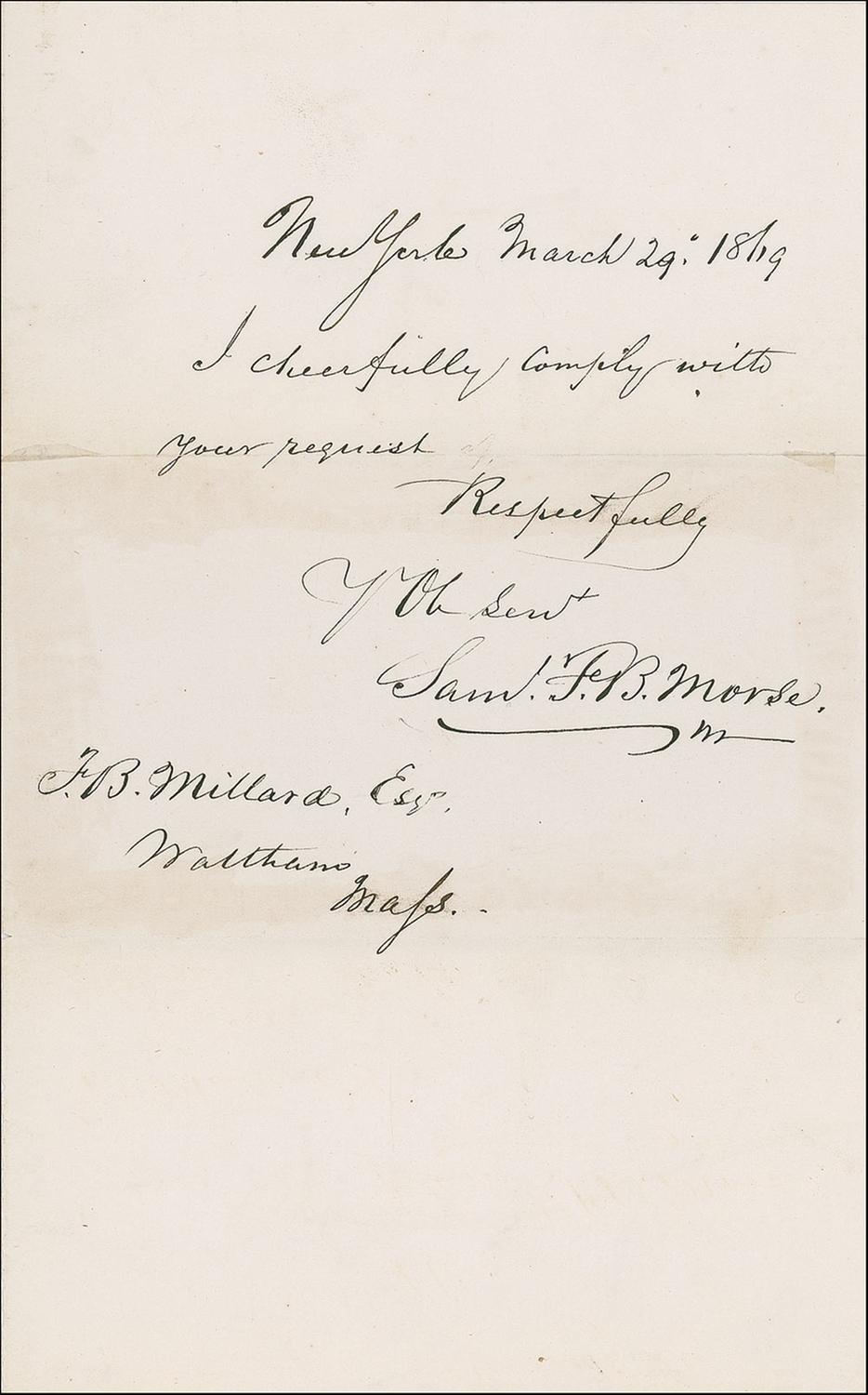 Inventor (1791–1872) best known for his creation of Morse code. ALS signed “Saml. F. B. Morse,” one page, 5 x 8, March 29, 1869. Responding from New York to a request for his signature, Morse writes in full ”I cheerfully comply with your request.” Tear along one horizontal fold interrupting “your” and the center panel affixed to a slightly larger card (perimeter mounting residue showing through, passing through the last letter of the signature and several words of text), otherwise fine condition.