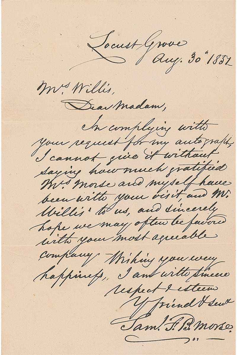 Bold ALS signed “Sam’l F. B. Morse,” one page, 4.75 x 7.25, Locust Grove, August 30, 1837. Letter to Mrs. Charles E. Willis. In part: “In complying with your request for my autograph, I cannot give it without saying how much gratified Mrs. Morse and myself have been with your visit.” In fine condition, with a couple trivial creases.