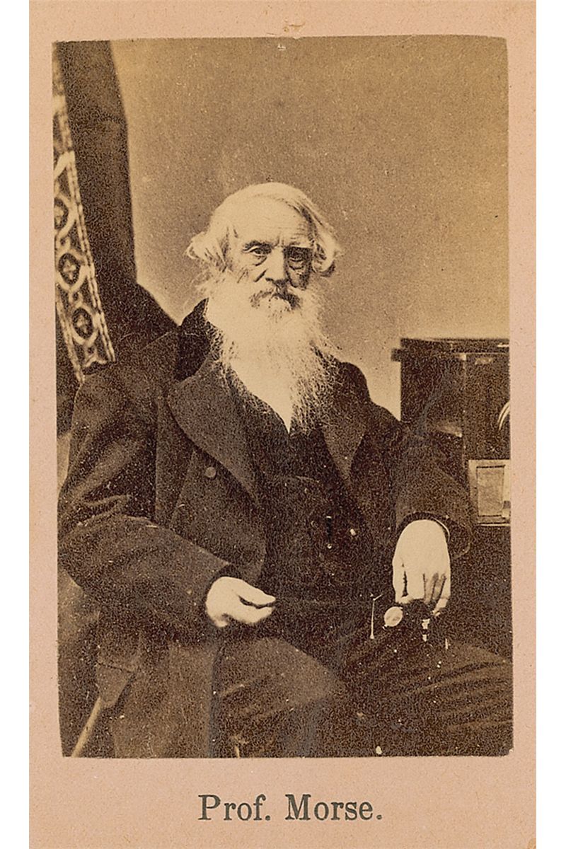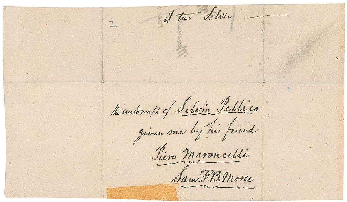 American artist and inventor (1791–1872) whose development of the telegraph revolutionized communication—and indeed, society as a whole—and represented a crucial step toward such later innovations as the telephone. Ink signature, “The autograph of Silvio Pellico, given me by his friend Piero Maroncelli, Sam. F. B. Morse,” on an off-white 6.5 x 3.75 slip, affixed to a same-size cardstock sheet. Intersecting folds and a toned piece of tape affixed to the lower border, otherwise fine condition. Accompanied by an unsigned carte-de-visite portrait of Morse.