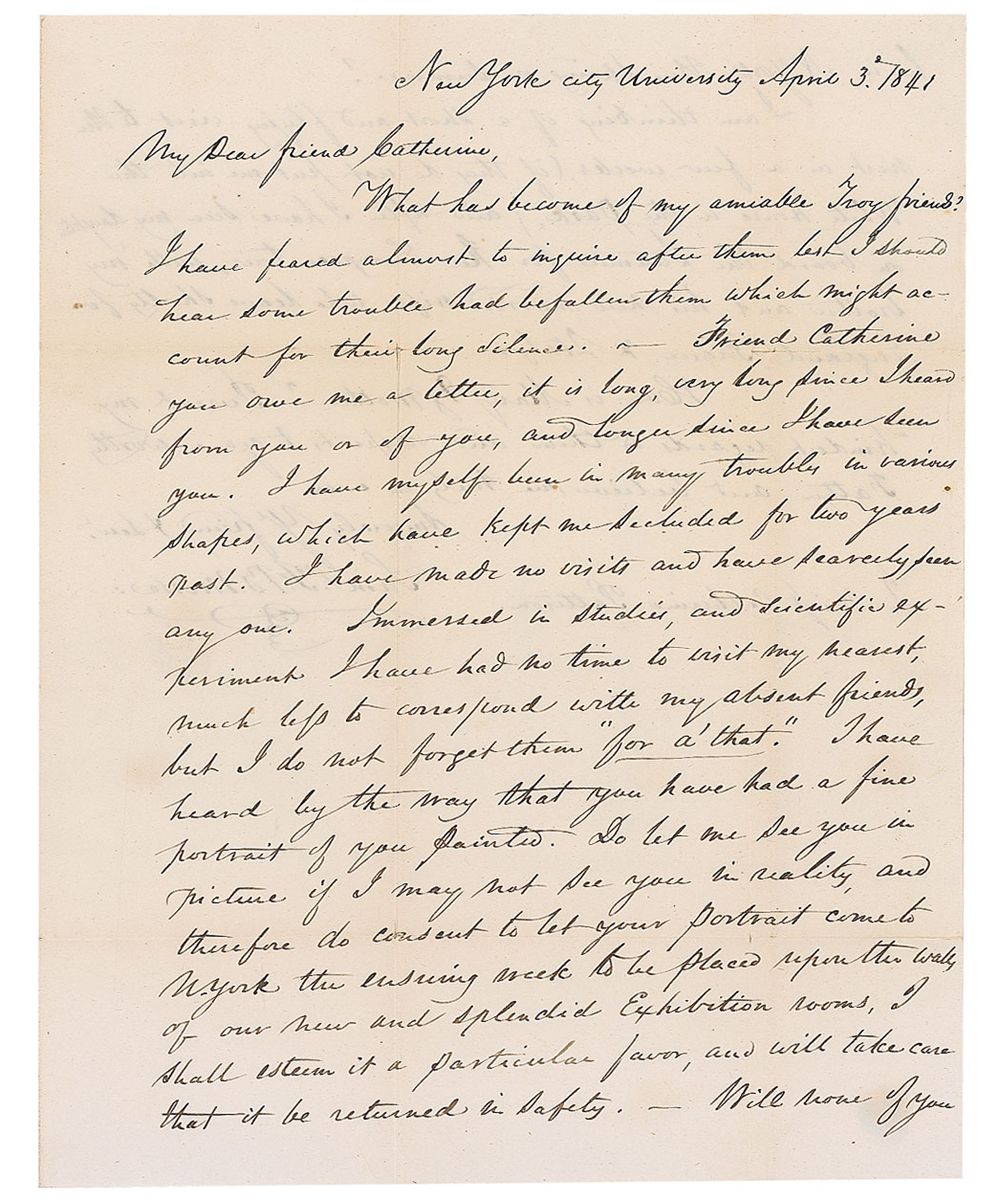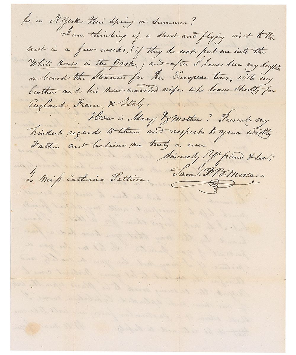 ALS signed “Sam. F. B. Morse,” one page both sides, 7.75 x 10, April 3, 1841. Letter to Catherine Pattison. In part: “What has become of my amiable Troy friends? I have feared almost to inquire after them lest I should hear some trouble had befallen them which might account for their long Silence. Friend Catherine, you owe me a letter, it is long, very long since I heard from you or of you…I have myself been in many troubles in various Shapes, which have kept me secluded for two years past. I have made no visits and have scarcely seen anyone. Immersed in studies and scientific experiment, I have had no time to visit my nearest much less to correspond with my absent friends, but I do not forget them ‘for a’ that.’ I have heard by the way that you have had a fine portrait of you painted. Do let me see you in the picture if I may not see you in reality, and therefore do consent to let your portrait come to N. York the ensuing week to be placed upon the walls of our new and splendid Exhibition rooms…Will none of you be in N. York this Spring or Summer? I am thinking of a short and flying visit to the west in a few weeks (if they do not put me in the White House in the park), and after I have seen my daughter on board the Steamer for her European tour, with my brother and his new-married wife who leave shortly for England, France & Italy.” Fragile intersecting folds, one through a single letter of signature, paper loss to edge of second integral page from seal, a few spots of trivial toning from seal, and a couple of small separations at junctions of folds, otherwise fine condition. In 1839, Morse dejectedly returned from a three-year trip to Europe to seek financial support for his telegraph. For the next four years, he worked feverishly to improve his invention, and obtain funds from Congress to build an experimental line from Washington, DC, to Baltimore. A deeply personal letter from Morse at the low point of his career.