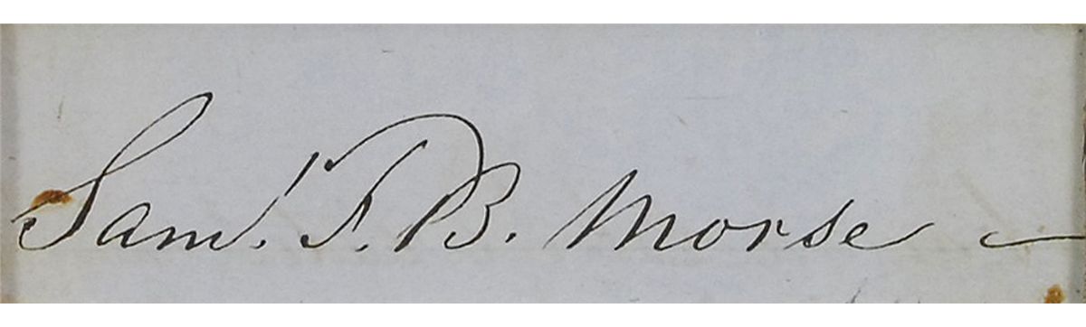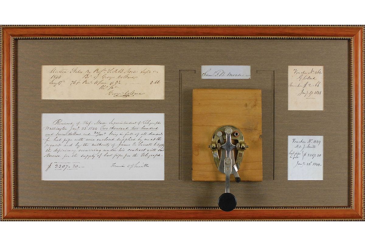 Ink signature, “Sam’l F. B. Morse,” on a light blue slip; unsigned ink endorsement, “Voucher No. 449 F. O. J. Smith lead pipe in full $2,207.20 Jany. 22 1844,” on the reverse of a manuscript document signed by Francis O. J. Smith, which reads, “Received of Prof. Morse Superintendent of the Telegraph Washington Jany 22 1844 Two thousand two hundred and seven dollars and 20/100, being in full of all demands for lead pipe with wire enclosed supplied by me at the request and by the authority of James E. Serrell to supply the deficiency occurring under his contract with said Morse for the supply of lead pipe for the Telegraph. Francis O. J. Smith $2207.20.”; and an unsigned ink endorsement, “Voucher No. 464, G. Collard, lumber $2.66 Jany. 17 1844,” on the reverse of a manuscript document signed by George Collard, which reads, “United States by Prof. S. F. B. Morse Supt. for Bn't of George Collard 1844 Jany 17 76 ft. paid W. Pine @ 3 1/2 2.66 Rcpt.” Matted and framed with copies of the endorsements, the front of the documents, and a clickable telegraph key to an overall size of 22.5 x 12. In fine condition.