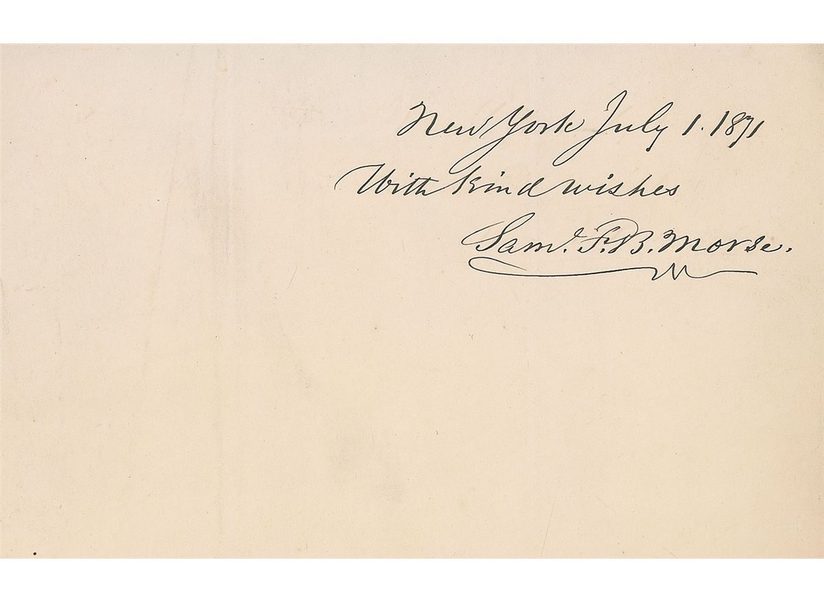 Bold ink signature, “New York, July 1, 1871, With kind wishes, Sam’l F. B. Morse,” on an off-white 8 x 5 sheet. In fine condition, with a few vertical folds (one passing through a single letter of the signature).