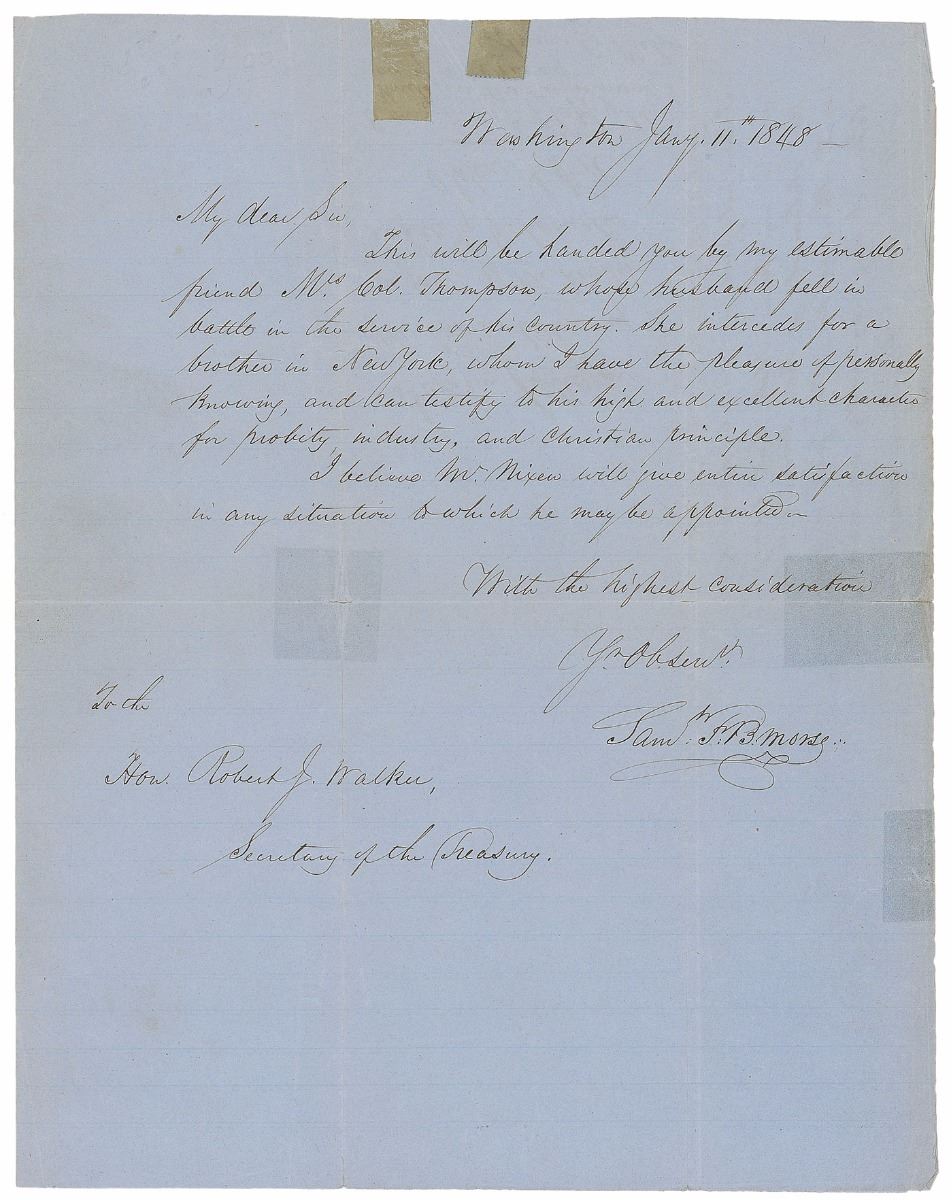 ALS signed “Sam’l F. B. Morse,” one page, 8.25 x 10.5, January 11, 1848. Letter to Secretary of the Treasury Robert J. Walker. In part: “This will be handed you estimable friend Mrs. Col. Thompson, whose husband fell in battle in the service of his country. She intercedes for a brother in New York, whom I have the pleasure of personally knowing, and can testify to his high and excellent character for probity, industry, and Christian principle.” Also endorsed on the reverse by John A. Dix and Thomas H. Benton. In very good condition, with intersecting folds (one vertical fold passing through a single letter of the signature), toned tape affixed to the top edge, and show-through from tape repairs to some separations.
