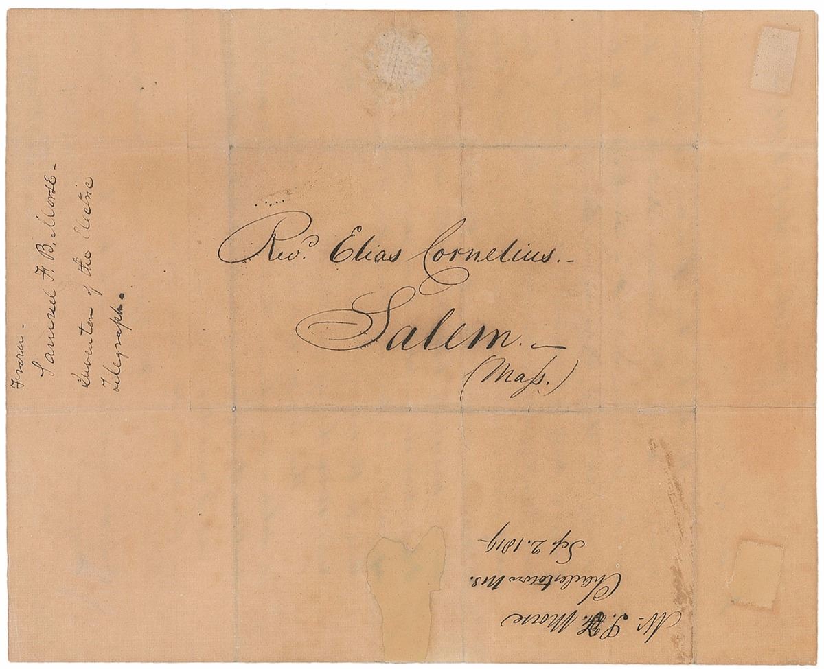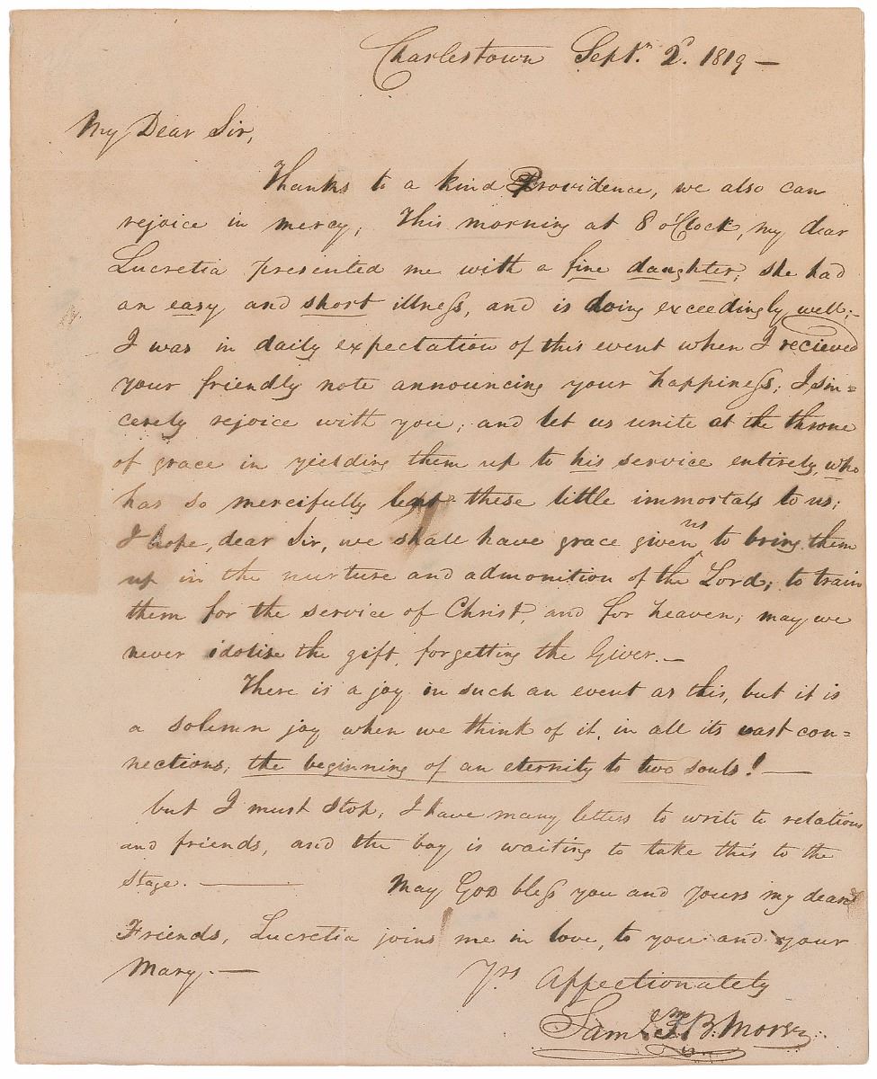 Early ALS signed “Sam’l F. B. Morse,” one page, 8 x 9.75, September 2, 1819. Letter to Reverend Elias Cornelius in Salem, Massachusetts. In part: “Thanks to a kind Providence, we also can rejoice in mercy; This morning at 8 o’clock, my dear Lucretia presented me with a fine daughter; she had an easy illness, and is doing exceedingly well…I received your friendly note announcing your happiness; I sincerely rejoice with you…There is a joy in such an event as this, but it is a solemn joy when we think of it, in all its vast connections, the beginning of an eternity to two souls!” In very good condition, with intersecting folds, a few unobtrusive repairs, block of toning to the left edge, and some brushing to ink. Morse’s eldest daughter, Susan Walker Morse, became the subject of his 1837 painting ‘The Muse,’ which represented a period of transition from his career as an artist to that of an inventor. An 8 x 10 color photo of ‘The Muse’ is included, along with two additional photos of a painting Morse did of himself and his daughter together at the Louvre.