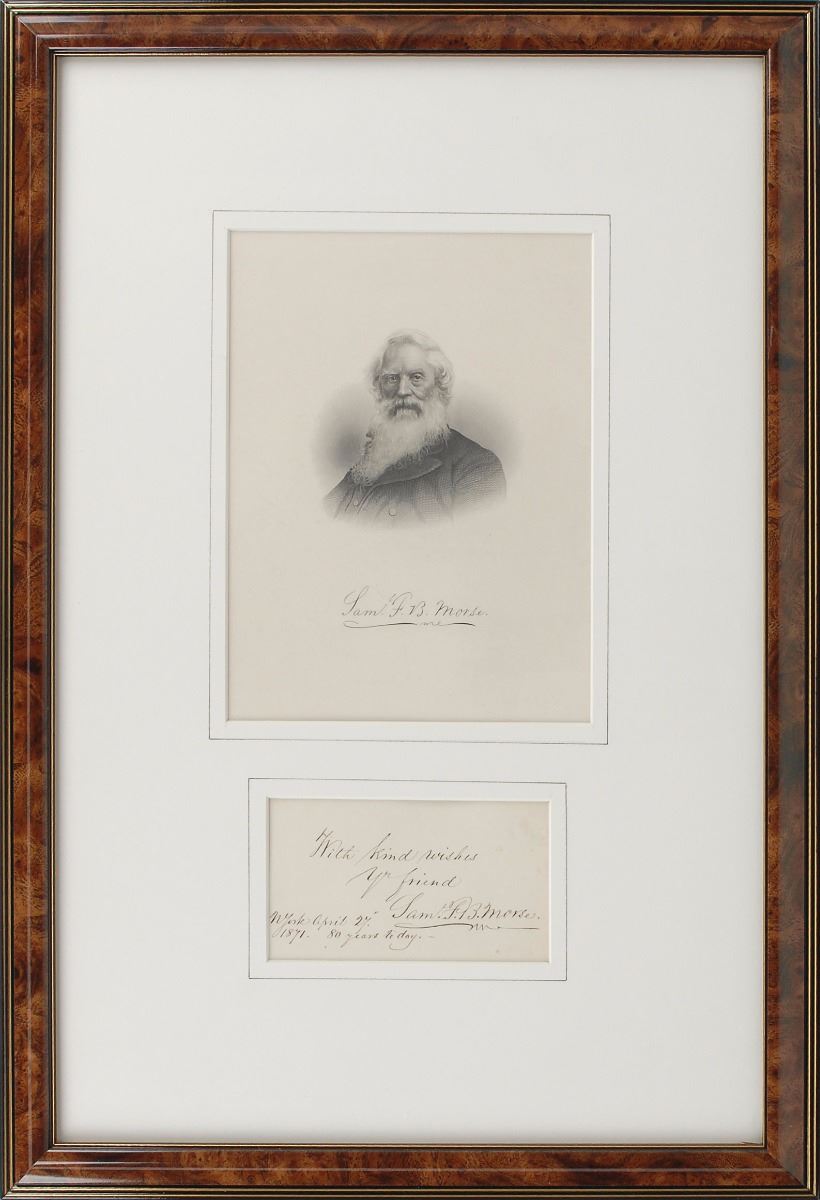 Ink signature, “With kind wishes, yr friend, Sam’l F. B. Morse, N. York, April 27, 1871, 80 years today,” on an off-white 4.5 x 2.75 sheet. Matted and framed with an engraved portrait bearing a facsimile signature. In fine condition.