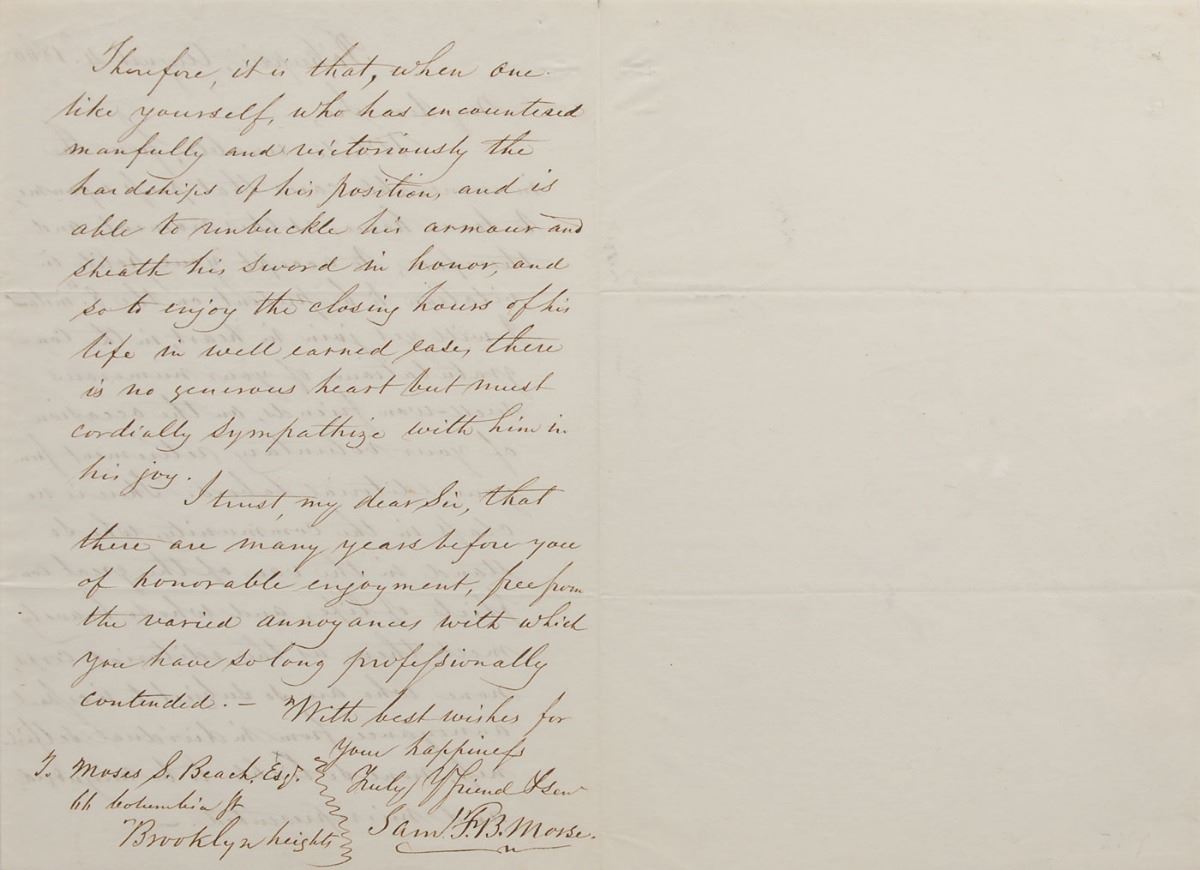 ALS signed “Saml. F. B. Morse,” one page both sides, 5.25 x 8, August 4, 1860. Letter to Moses Sperry Beach, former editor and proprietor of the New York Sun. In part: “While unable…to accept your polite invitation to be present on the 8th instant, I will yet join in heart, in the congratulations of your numerous well-won friends, on the occasion of your voluntary retirement from your editorial labors. There is no class in the community, who so stand in the van of the great conflicts of life, and who so bravely meet them as the editorial corps, none who are so subject to incessant annoyance from individual selfishness, none so liable to be misjudged, and misrepresented. Therefore, it is that, when one like yourself, who has encountered manfully and victoriously the hardships of his position, and is able to unbuckle his armour and sheath his sword in honor, and so to enjoy the closing hours of his life in well earned ease, there is no generous heart but must cordially sympathize with him in his joy.” Encapsulated in a mylar sleeve. In fine condition, with writing lightly showing through from opposing sides. Accompanied by a full letter of authenticity from PSA/DNA. A beautifully preserved example.