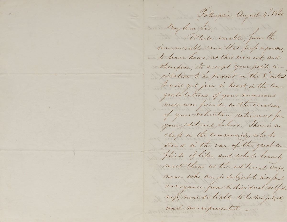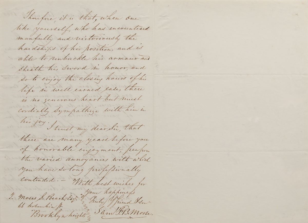 ALS signed "Saml. F. B. Morse," one page both sides, 5.25 x 8, August 4, 1860. Letter to Moses Sperry Beach, former editor and proprietor of the New York Sun. In part: "While unable...to accept your polite invitation to be present on the 8th instant, I will yet join in heart, in the congratulations of your numerous well-won friends, on the occasion of your voluntary retirement from your editorial labors. There is no class in the community, who so stand in the van of the great conflicts of life, and who so bravely meet them as the editorial corps, none who are so subject to incessant annoyance from individual selfishness, none so liable to be misjudged, and misrepresented. Therefore, it is that, when one like yourself, who has encountered manfully and victoriously the hardships of his position, and is able to unbuckle his armour and sheath his sword in honor, and so to enjoy the closing hours of his life in well earned ease, there is no generous heart but must cordially sympathize with him in his joy." Encapsulated in a mylar sleeve. In fine condition, with writing lightly showing through from opposing sides. Accompanied by a full letter of authenticity from PSA/DNA. A beautifully preserved example. Pre-certified PSA/DNA.