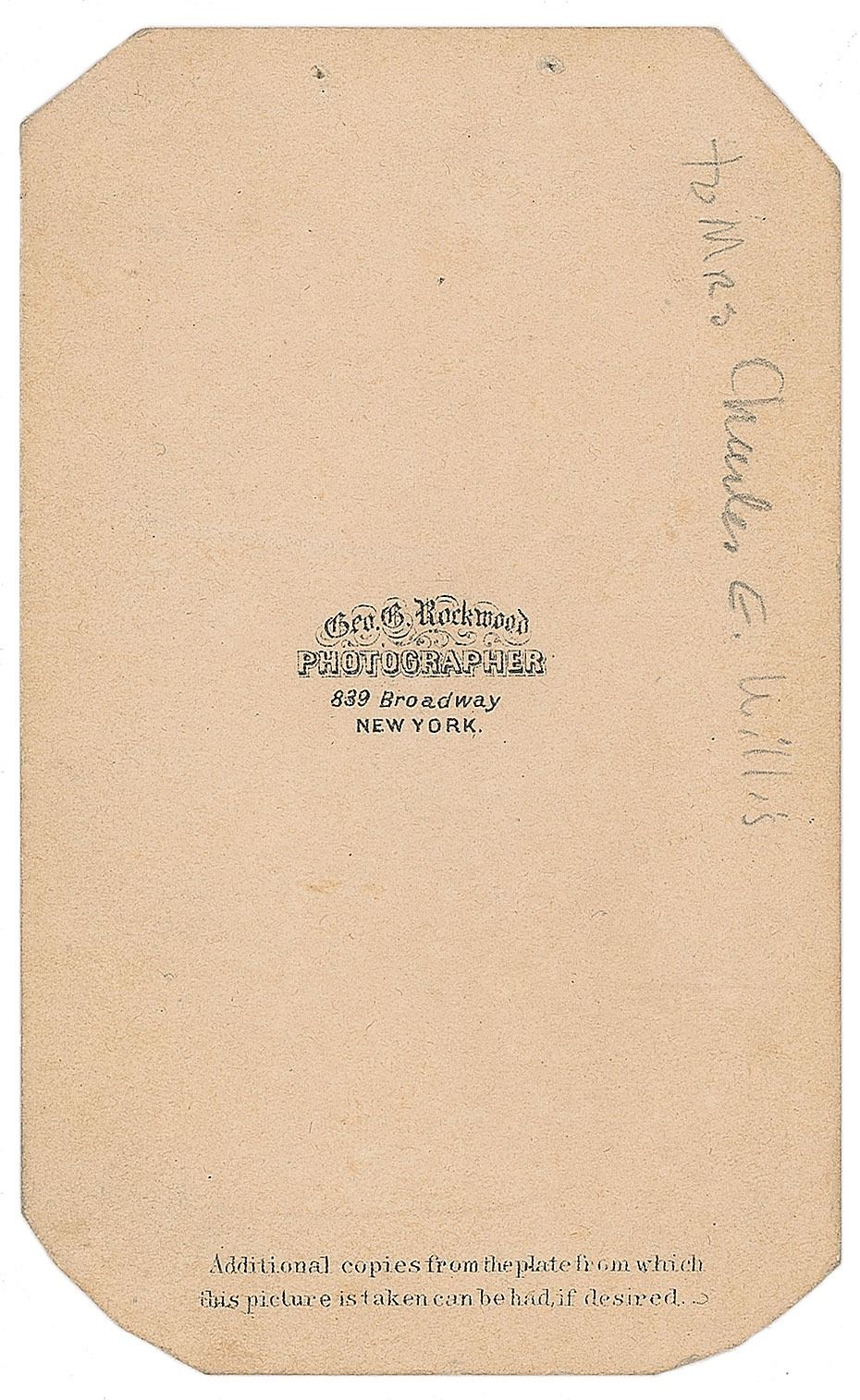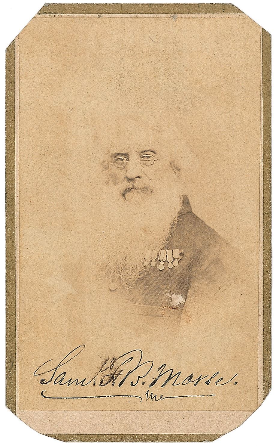 Uncommon 2.5 x 4 carte-de-visite portrait of Morse with medals adorning his chest, boldly signed in black ink, "Saml. F. B. Morse." Reverse bears the backstamp of photographer George G. Rockwood of New York. In very good to fine condition, with clipped corners, light overall soiling, and a slight brush to Morse's middle initials. A scarce autographed image of the world-changing inventor.