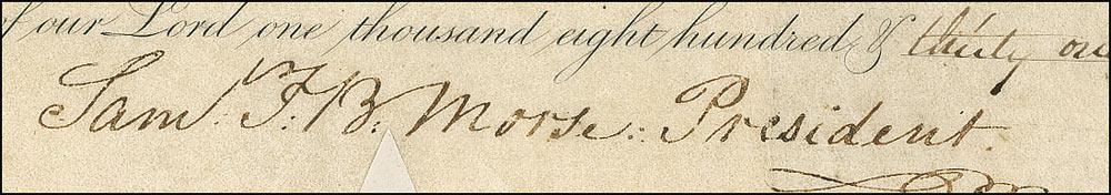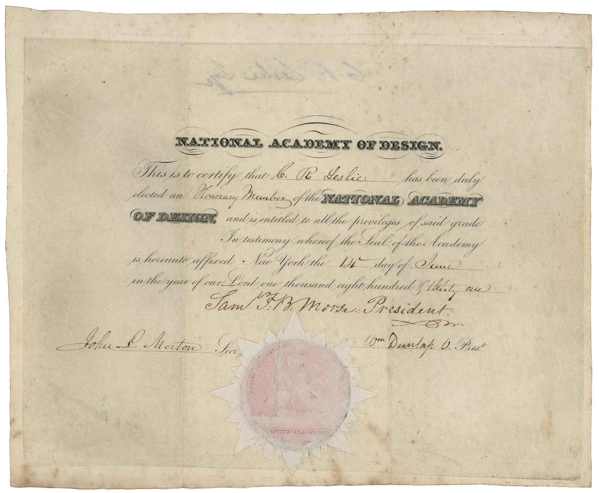 Partly-printed DS, signed “Sam. F. B. Morse, President,” one page on vellum, 10.75 x 8.75, June 14, 1831. A certificate for C. R. Leslie as an honorary member of the National Academy of Design. Charles Robert Leslie (1794–1859), born in London to American parents, attained fame for his paintings of biblical and historical scenes and for a series of works bases on Don Quixote. Leslie moved to the U.S. in 1833 to take up a post as teacher of drawing at West Point. Less than a year later, discouraged by his wife’s poor health, and encouraged by a lucrative commission, Leslie returned to England, where he remained for the rest of his career. Morse, together with eminent fellow artists Asher B. Durand and Thomas Cole, had founded the National Academy of Design in 1825. At the time of signing, Morse was in Europe to study art masterpieces and was at the height of his own career as a painter; in the same year, he commenced his most ambitious and best-known work, Gallery of the Louvre, which reproduces 41 Old Masters in miniature. In the same year, Michael Faraday and Joseph Henry conducted research on electromagnetic phenomena that was the direct inspiration, in the following year, for Morse’s conception of a single-circuit, electro-magnetic telegraph. Countersigned by John L. Morton and Wm. Dunlap. The handsome embossed paper seal remains intact. Two vertical folds (touching “President”) and mild soiling with a few faint, tiny spots, otherwise fine condition. Unusual in this format! RRAuction COA.