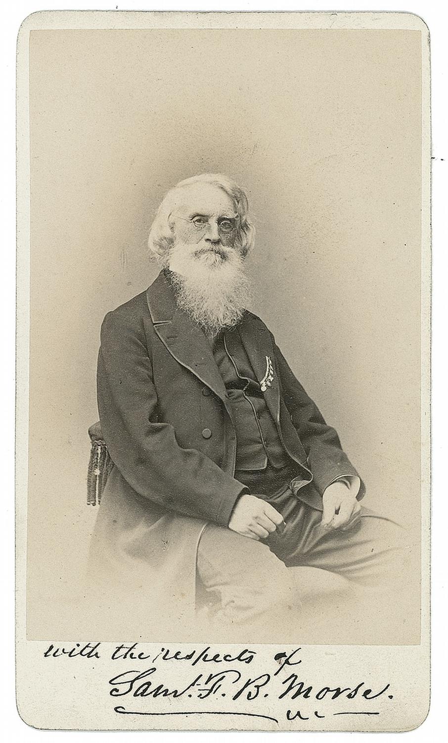 American artist and inventor (1791–1872) whose development of the telegraph revolutionized communication—and indeed, society as a whole—and represented a crucial step toward such later innovations as the telephone. Fantastic original vintage 2.5 x 4 carte-de-visite seated portrait by Hanns Hanfstaengl of Dresden (and so stamped on the reverse), signed in the lower border in black ink, “With the respects of Saml. F. B. Morse.” Ink notation on reverse indicates, “January 1868.” An outstanding example in fine condition. Provenance: The Barry Hoffman Collection.