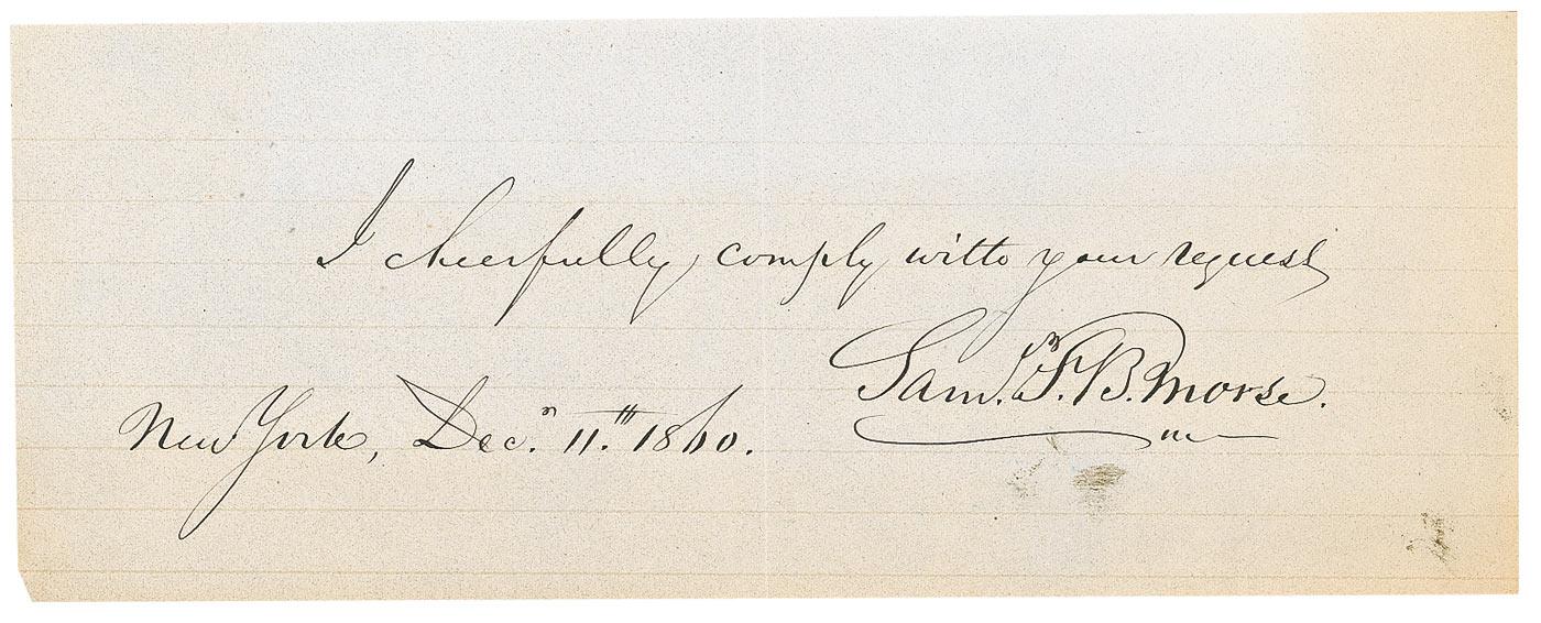 ANS signed “Saml. F. B. Morse,” one page, lightly-lined, 7.75 x 3, December 11, 1860. Brief note in response to a signature request. In full: “I cheerfully comply with your request.” A central vertical fold, scattered light toning over signature and portion of text, and a few stray ink marks, otherwise fine condition. Morse’s mood was probably bolstered at this time as he had finally been awarded thousands of dollars by countries who had been using his invention for years.